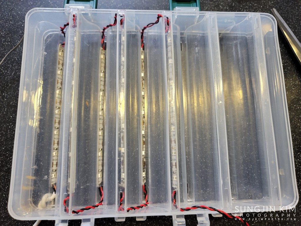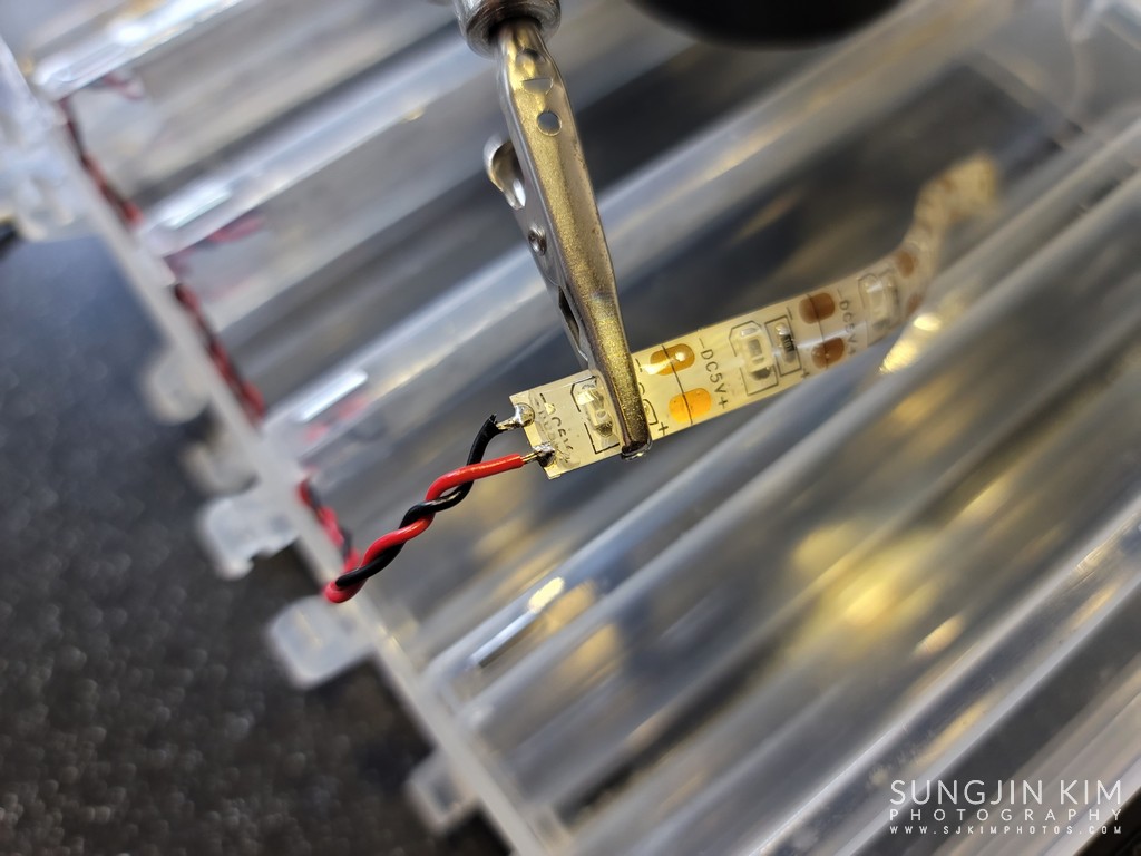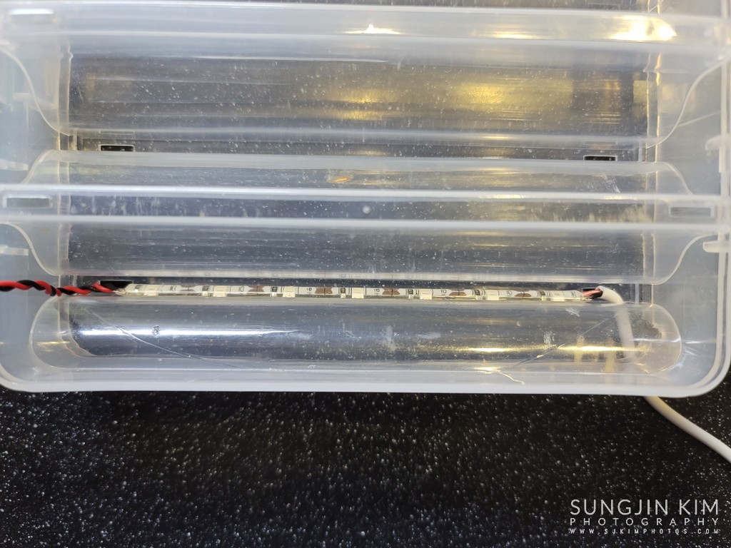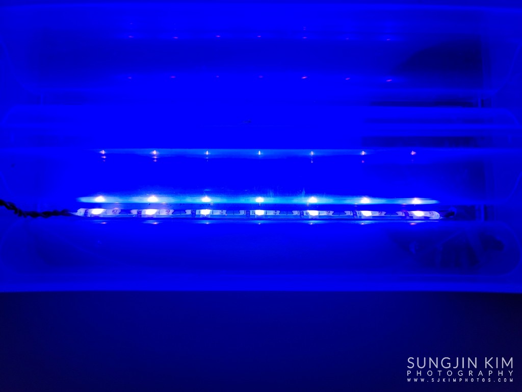 플라스틱 케이스의 물빠짐 홈마다 UV LED 스트립을 인두기를 이용하여 납땜을 해주고 양면테이프로 장착하기 때문에 생각보다 시간이 많이 걸린다. 많이 한가한 날에 날 잡고 작업하는게 좋다.