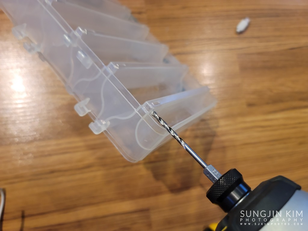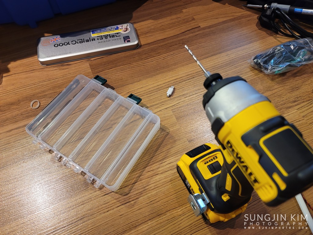 작업이 모두 끝나고 케이스에 전선이 통과할 부분을 드릴로 구멍을 뚫어준다. 위/아래로 어긋나게 통과하므로 잘 생각해서 뚫어야 한다. 아니면 사전에 네임팬으로 표시를 해두도록 하자.