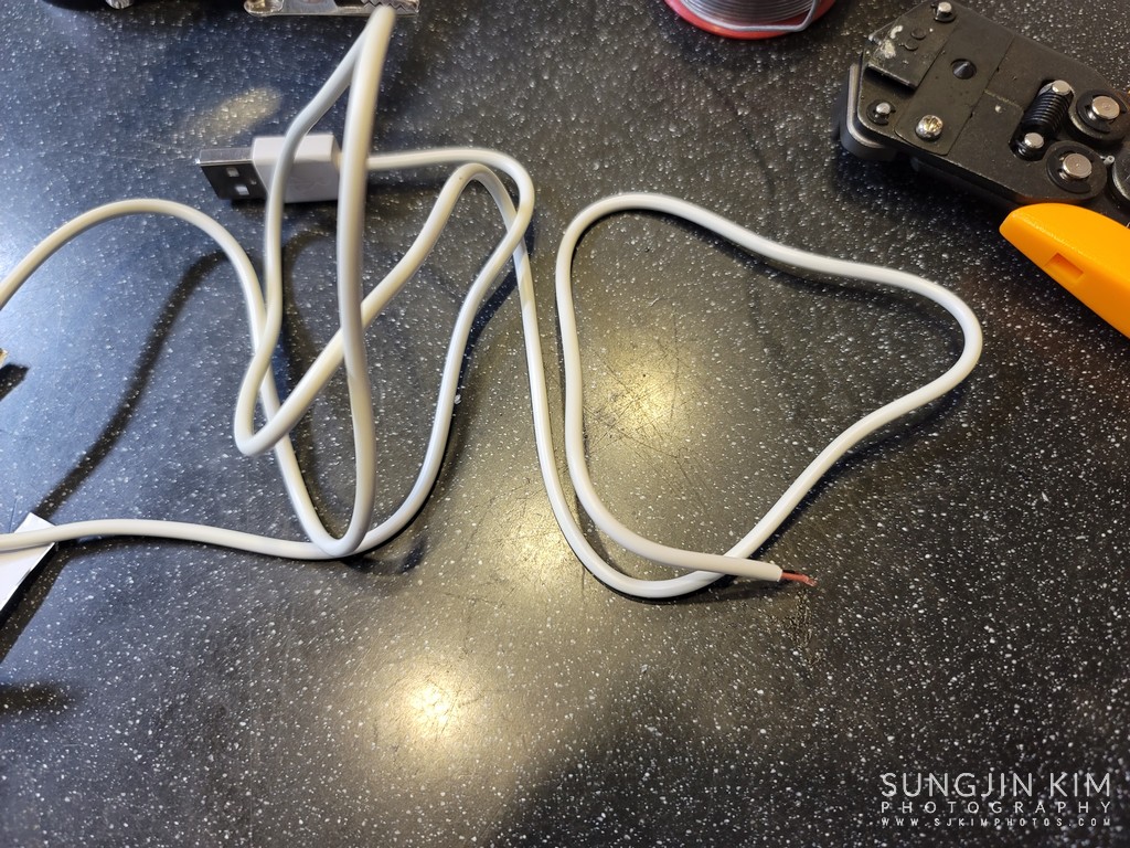 USB 전원을 연결하기 위한 케이블을 준비한다. 겉의 피복을 벗기면 검은색과 빨간색 전선이 보이는데, 검은색이 마이너스(-) 그리고 빨간색이 플러스(+)이다. UV LED 스트립의 접점 부위의 표시를 보고 잘 맞추어서 납땜을 하면 된다.