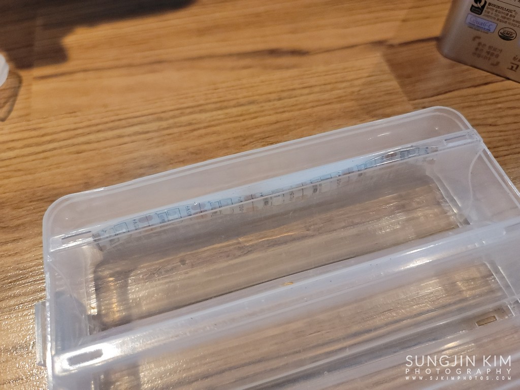 샘플로 길이에 맞춰 자른 UV LED 스트립을 케이스의 물빠짐 홈에 끼워 본 모습. UV LED 스트립은 위/아래의 물빠짐 홈에 서로 반대방향을 바라보게 장착할 예정이다.