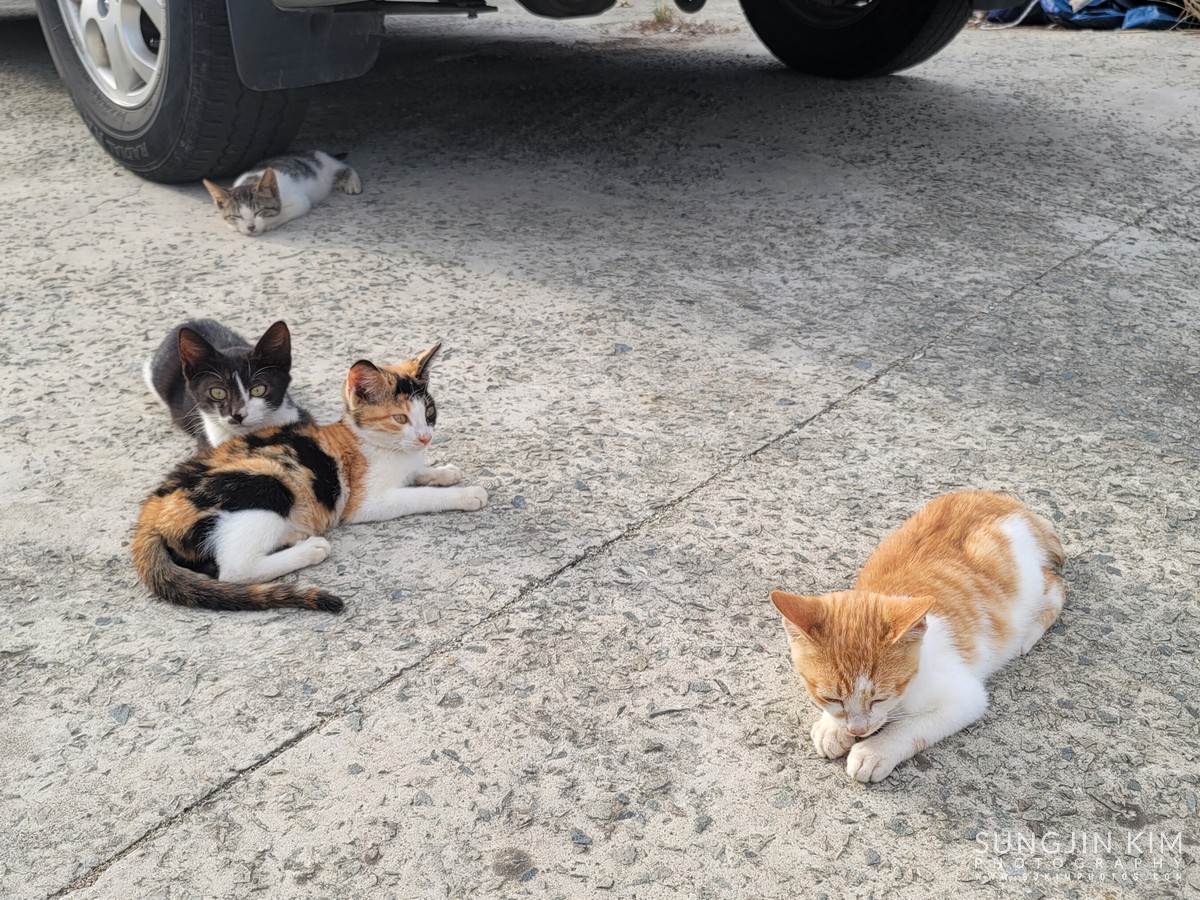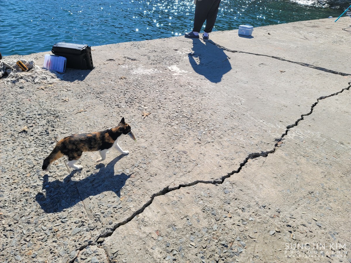 펜션 앞의 방파제에 짬낚시 하러 갔다가 한 마리도 못 낚고 다른 조사님이 잡은 고기를 열심히 물고 가는 냥이만 목격...