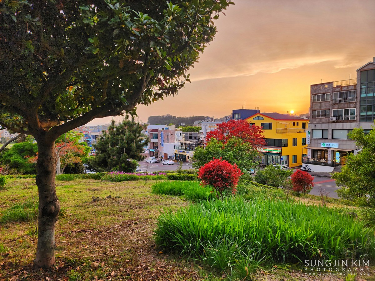 숙소에 체크인 후 저녁을 먹고 산책 중에 만난 노을. 노란색 건물 뒤로 지는 해와 전경의 붉은색 식물의 대비가 아름다워서 한 장 찍어주고...