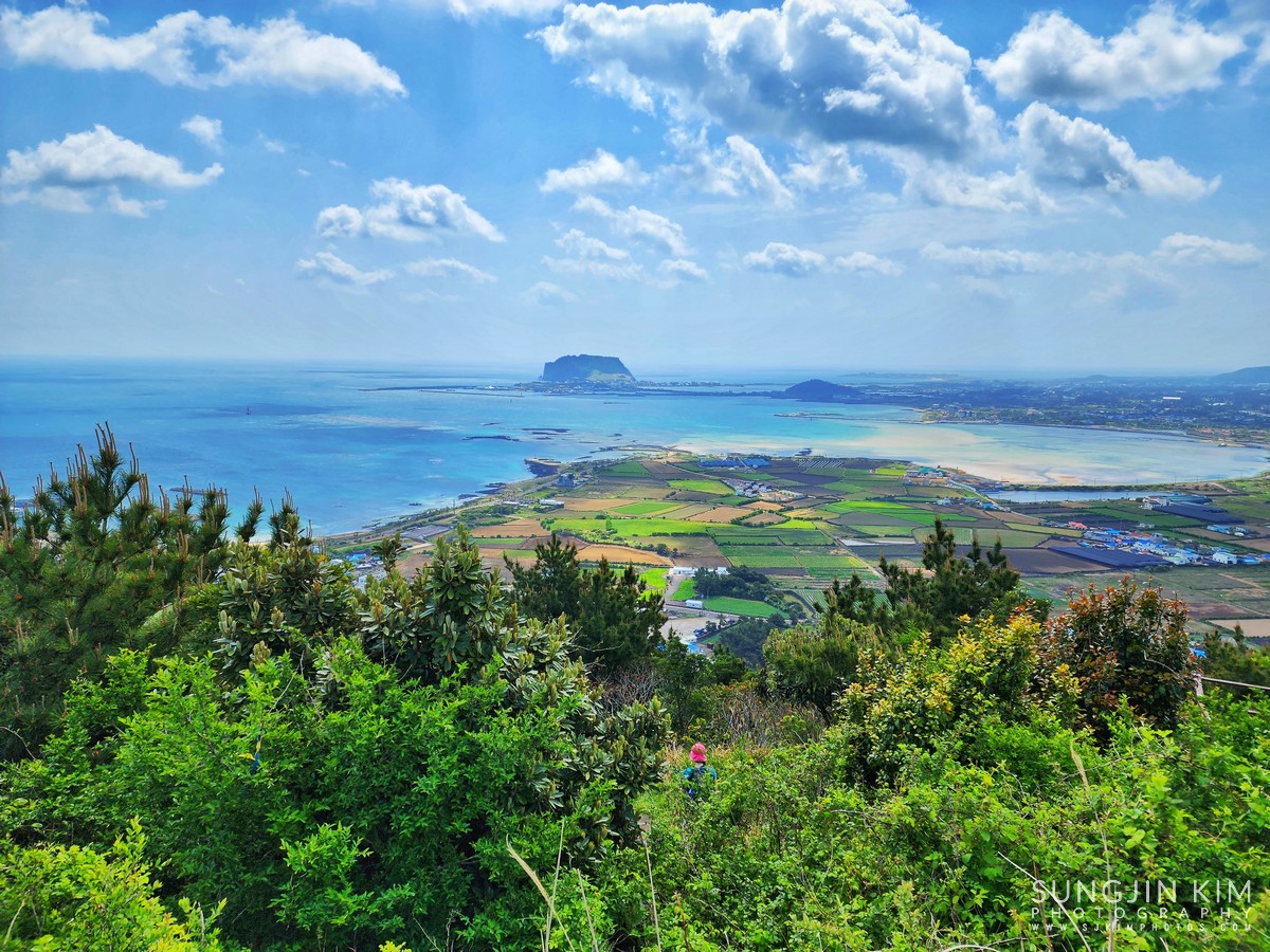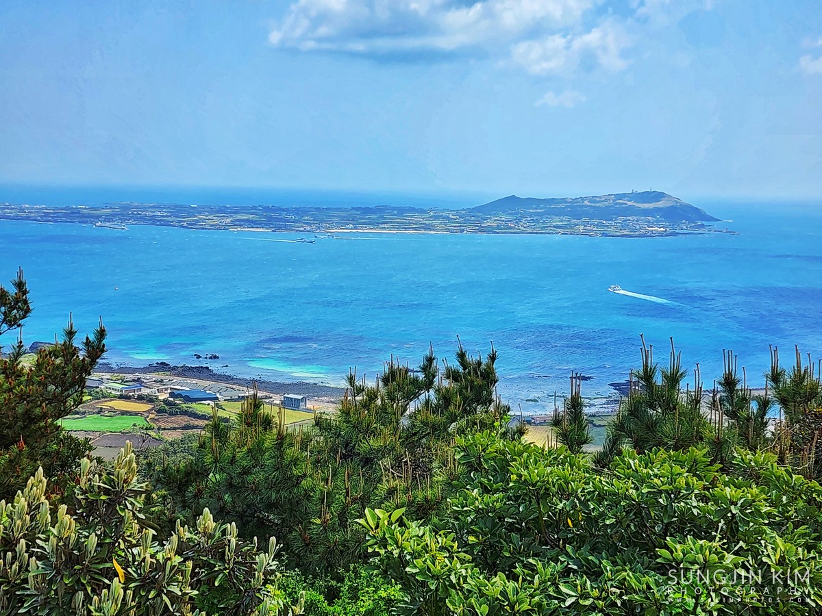 둘째날, 제주도 동쪽에 우도에서 가까운 지미봉을 올라 전망대에서 우도와 성산일출봉이 같이 보이는 전망을 담았다.