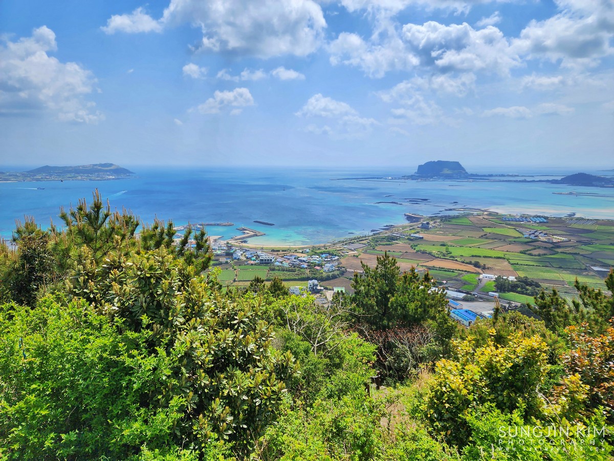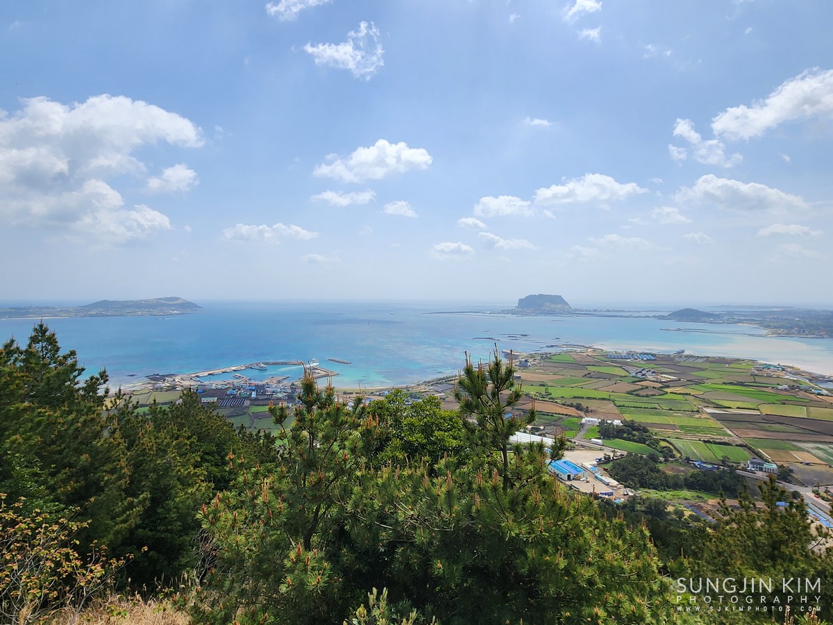 둘째날, 제주도 동쪽에 우도에서 가까운 지미봉을 올라 전망대에서 우도와 성산일출봉이 같이 보이는 전망을 담았다.