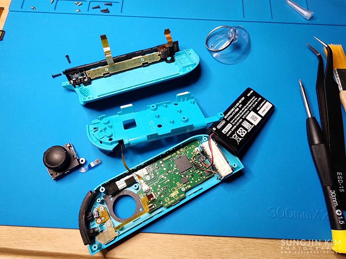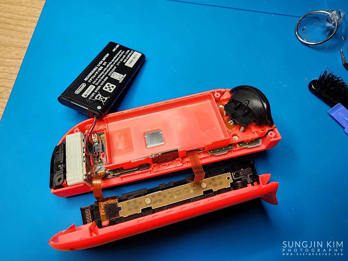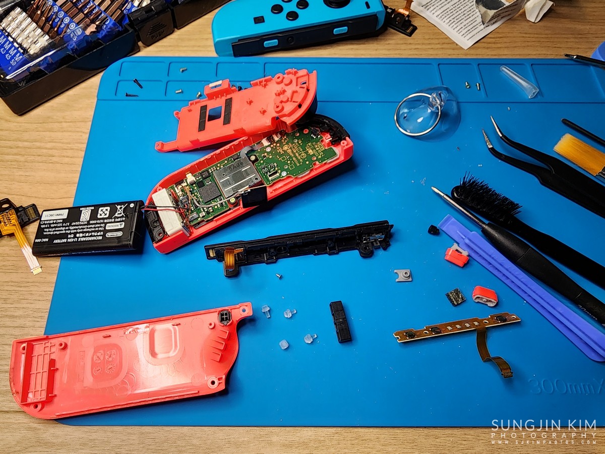 조이콘을 순서대로 분해하면서 나사들은 잃어버리지 않도록 순서대로 모아둔다. 세월이 오랜된 만큰 내부에 이물질과 먼지도 많기 때문에 솔과 알코올로 청소하면서 진행한다.