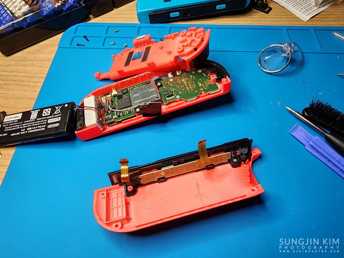 조이콘을 순서대로 분해하면서 나사들은 잃어버리지 않도록 순서대로 모아둔다. 세월이 오랜된 만큰 내부에 이물질과 먼지도 많기 때문에 솔과 알코올로 청소하면서 진행한다.