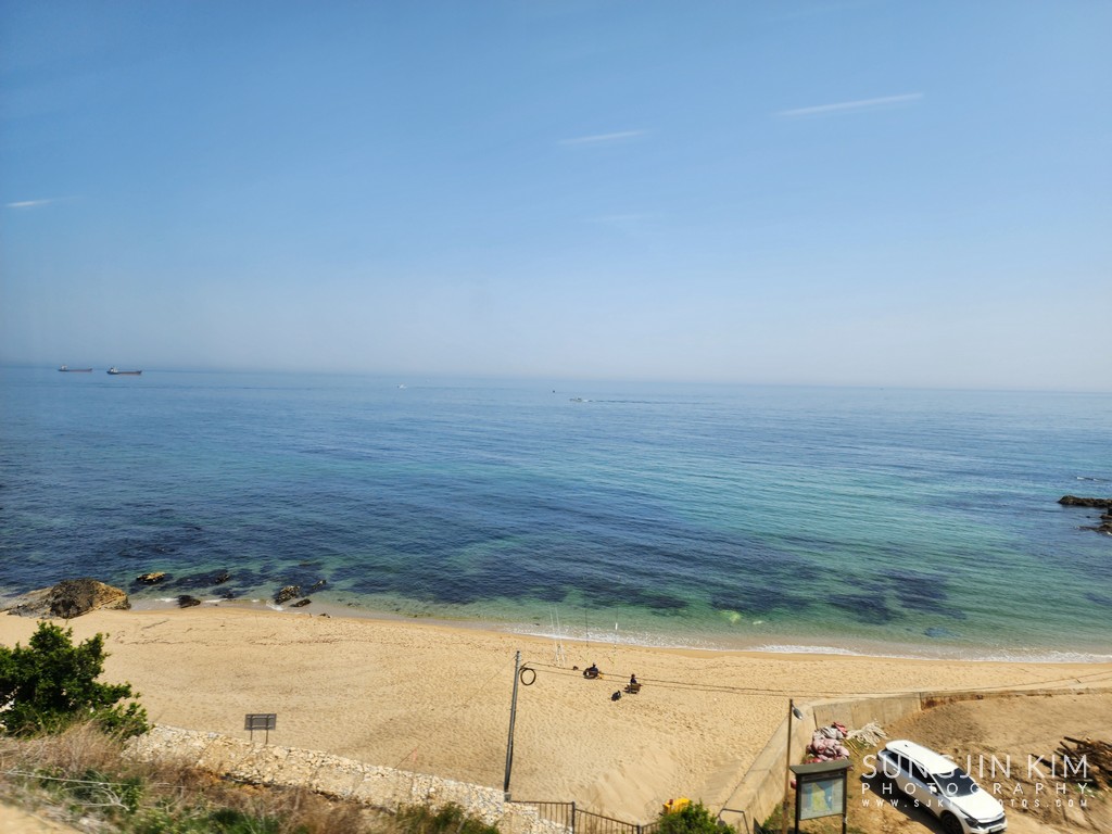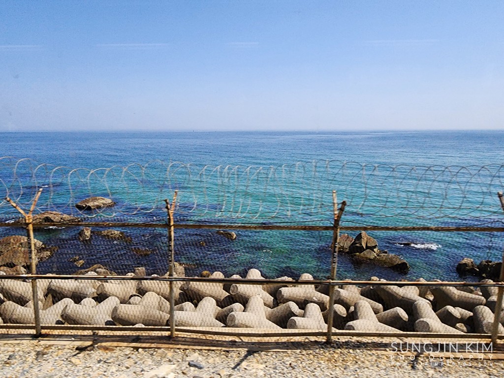 차창 밖으로 보이기 시작하는 파란 동해 바다 풍경...
