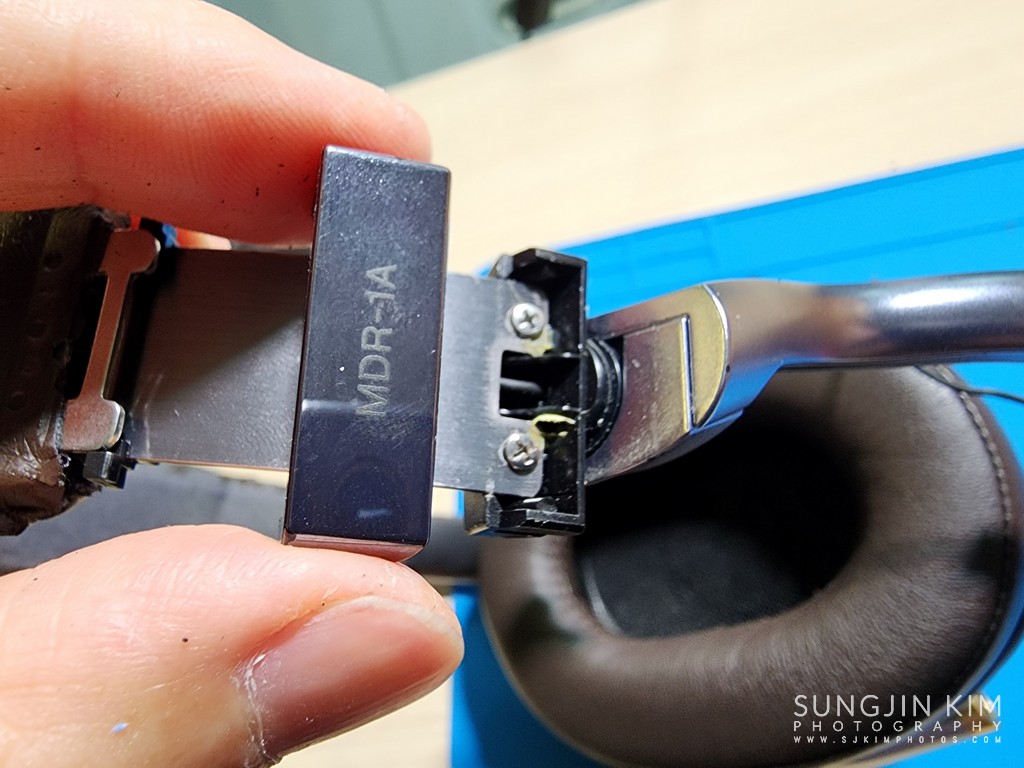 다음 차례는 헤드밴드에 연결된 Y자 모양의 플라스틱을 분해하기 위해 MDR-1A 모델명이 프린트된 플라스틱 부품을 잡아빼면 헤드밴드 내부에 연결된 금속 부분이 고정된 나사가 보인다.