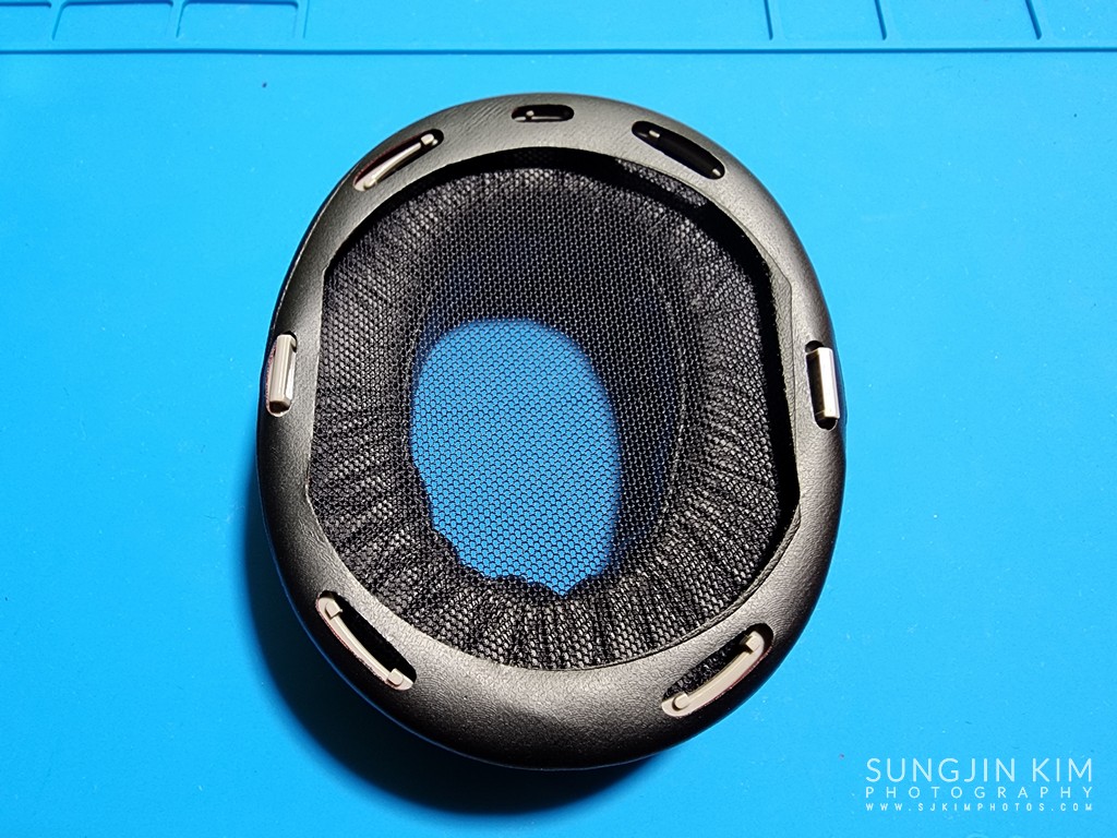 이어패드 내에 장착되어 있는 플라스틱 틀을 꺼내서 새로운 이어패드에 장착해 주고 헤드밴드 교체를 위한 과정으로 진행한다.