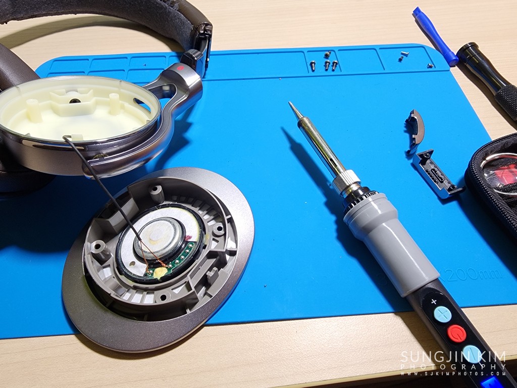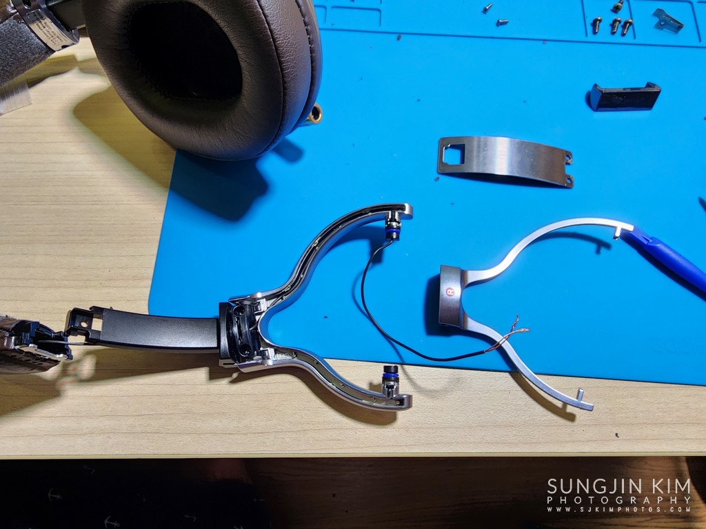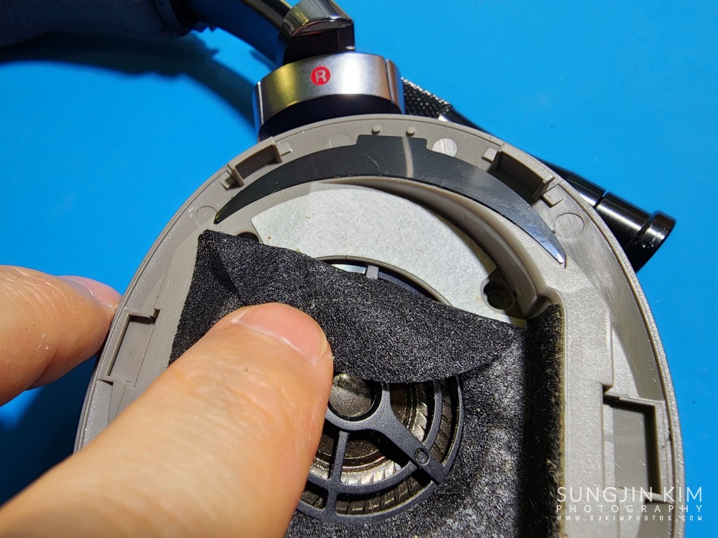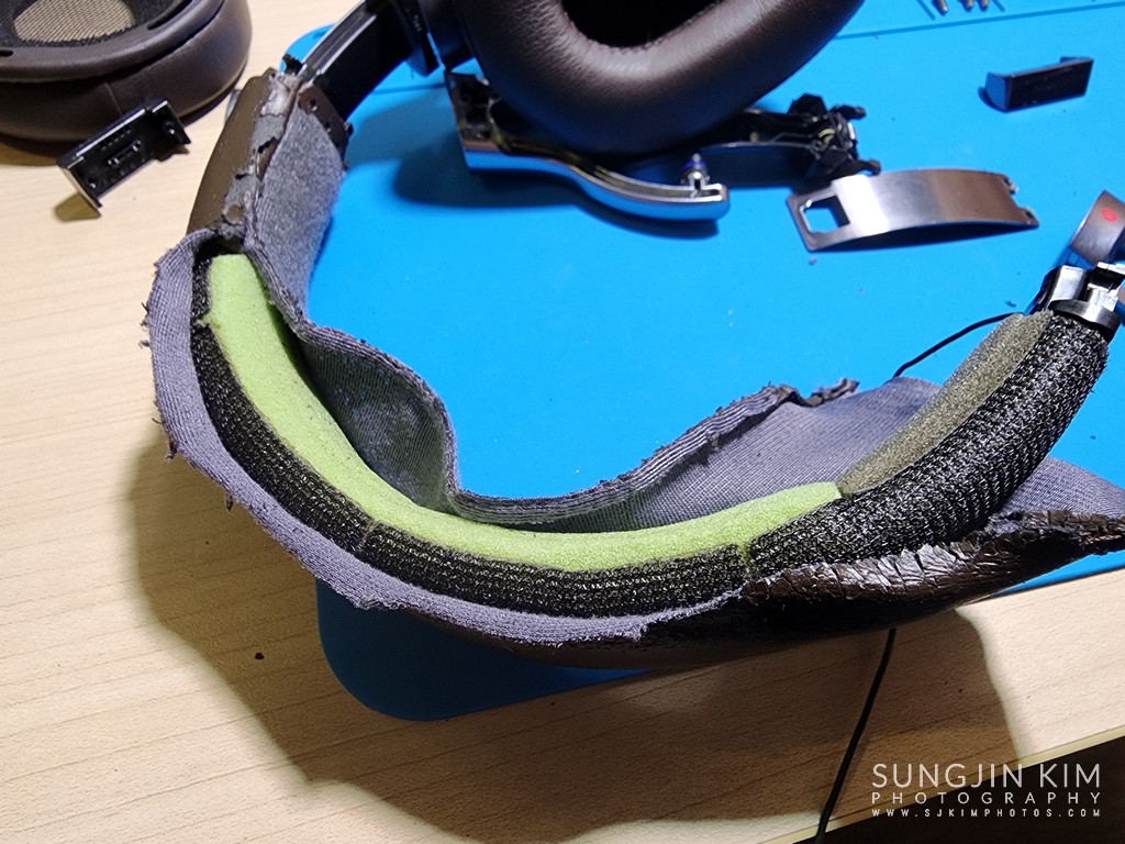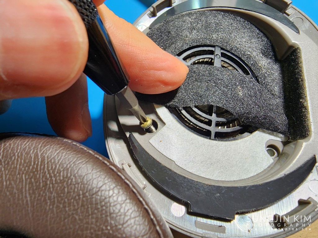 헤드밴드를 교체하기 위해서는 한쪽 유닛을 완전히 분해해서 헤드폰 유닛에 납땜되어 있는 와이어를 탈거해야 하는 아주 힘든 과정을 진행해야 한다. 와이어가 상대적으로 적게 들어 있는 오른쪽 유닛의 분해를 위해 부직포 밑 위/아래에 숨어 있는 4개의 나사를 풀어준다.