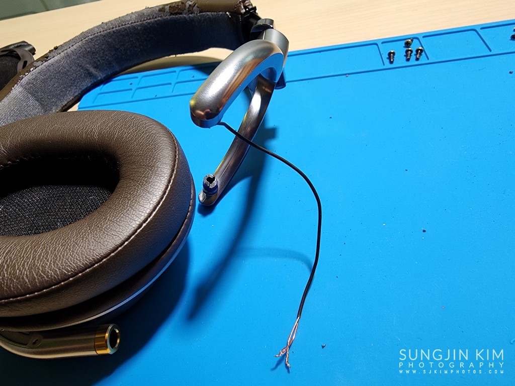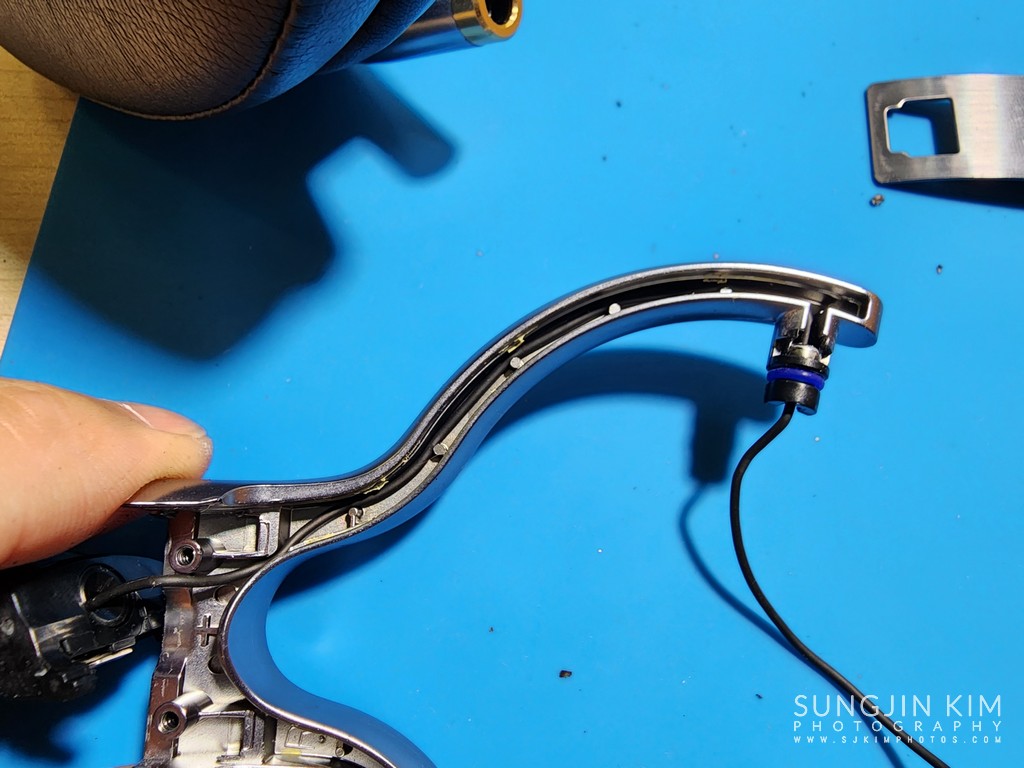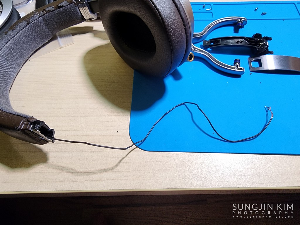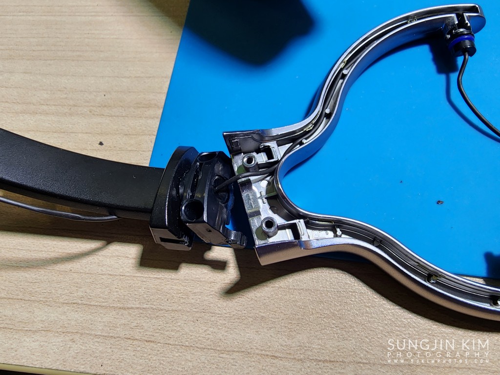 와이어만 남기고 모두 분해된 모습. 이제 기존 헤드밴드를 제거하고 새로운 헤드밴드를 장착할 수 있다.