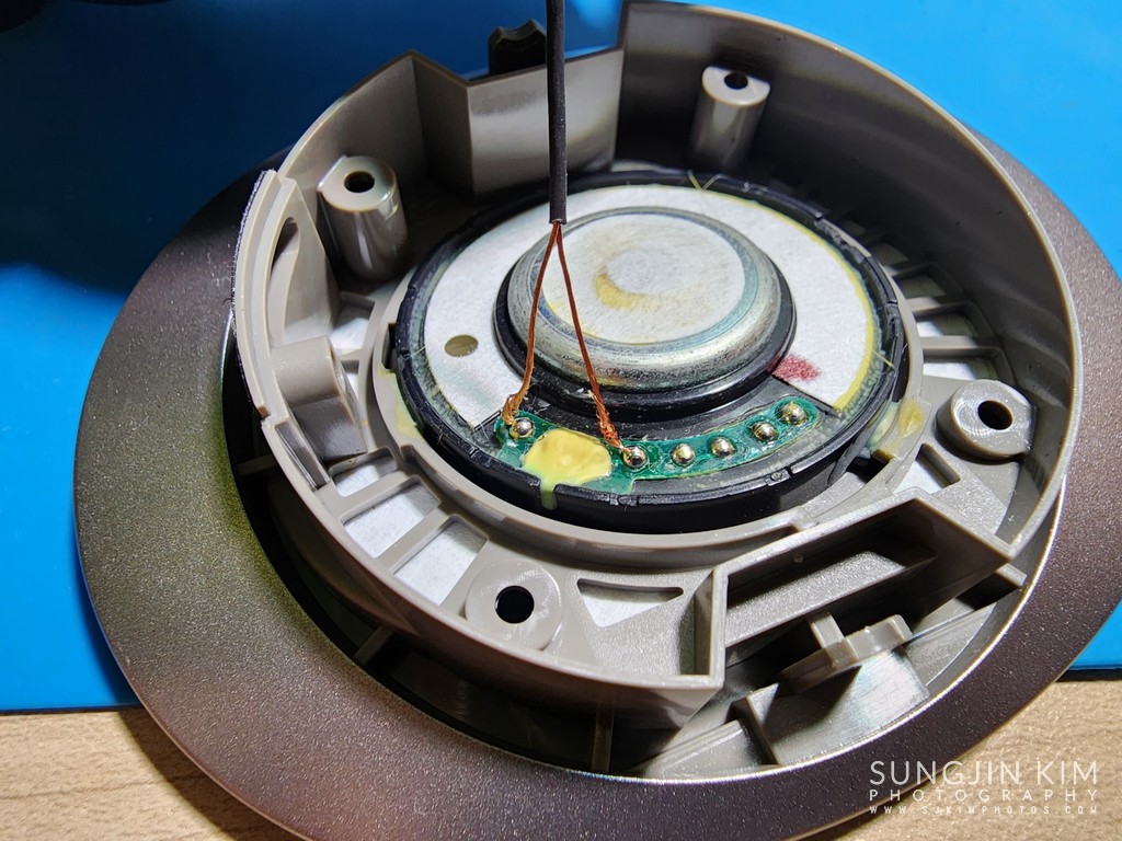 나사를 풀고 유닛을 분해하면 헤드폰에 납땜되어 있는 와이어를 확인할 수 있다. 추후 납땜으로 결합할 때 극성이 바뀌지 않도록 사진을 꼭 찍어두어서 와이어의 색깔을 기억해 둔다.