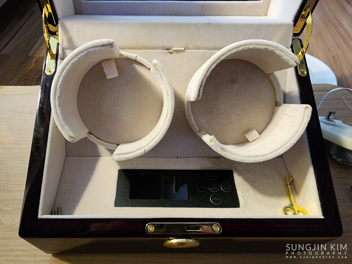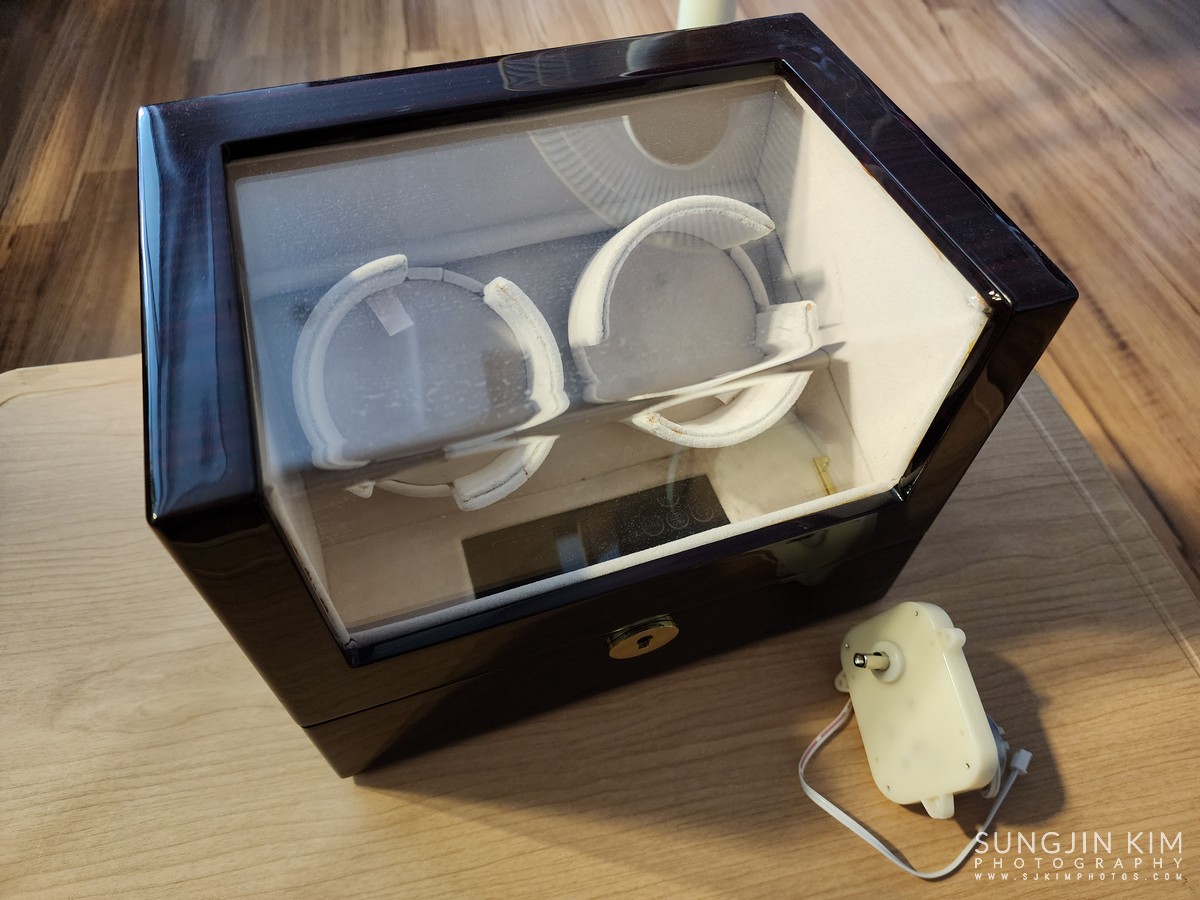 고장부위를 찾아보기 위해 분해한 워치 와인더. 2구짜리 워치 와인더이기 때문에 두 개의 모터 모듈이 장착되어 있다.
