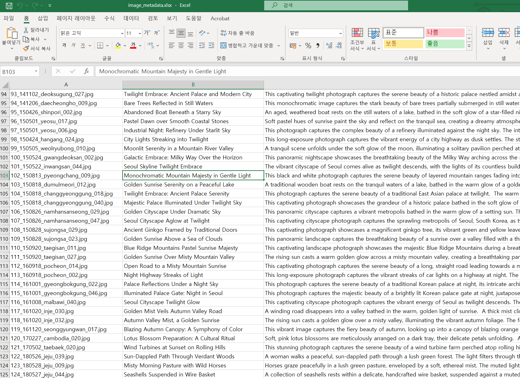 Python 스크립트를 실행해보니 일부 일출과 일몰 사진을 헷갈려하는 것 외에는 거의 99% 대만족이다. 특히 사진 중에 확연하게 인식이 가능한 우리나라의 유명한 관광지나 장소들은 제미나이가 자동으로 인식하여 제목과 설명에도 자동으로 기술해주는 것을 확인할 수 있었다.