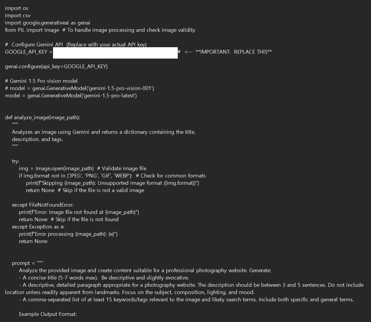 Python 스크립트의 동작은 아주 간단하다. 첫번째, 스크립트를 시작하면 구글 Gemini 1.5 Pro API와 연동하여 PC의 특정 폴더에 있는 사진들을 분석한다. 둘째, 분석한 사진들의 영문 제목, 설명 및 태그를 CSV 파일 형태로 생성한다.