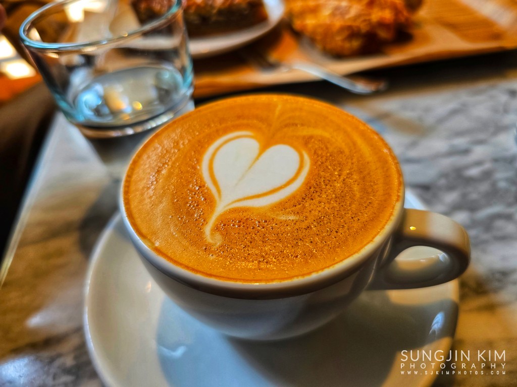 부드러운 우유와 진한 커피의 조화와 라떼 아트가 아름다운 커피 한 잔