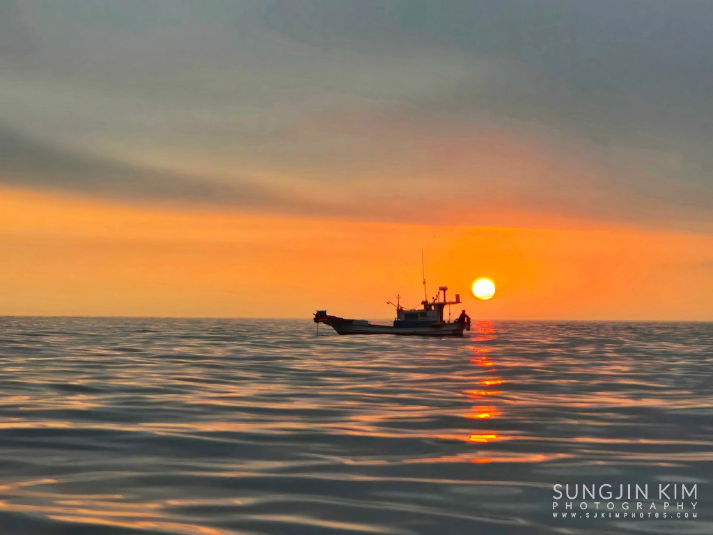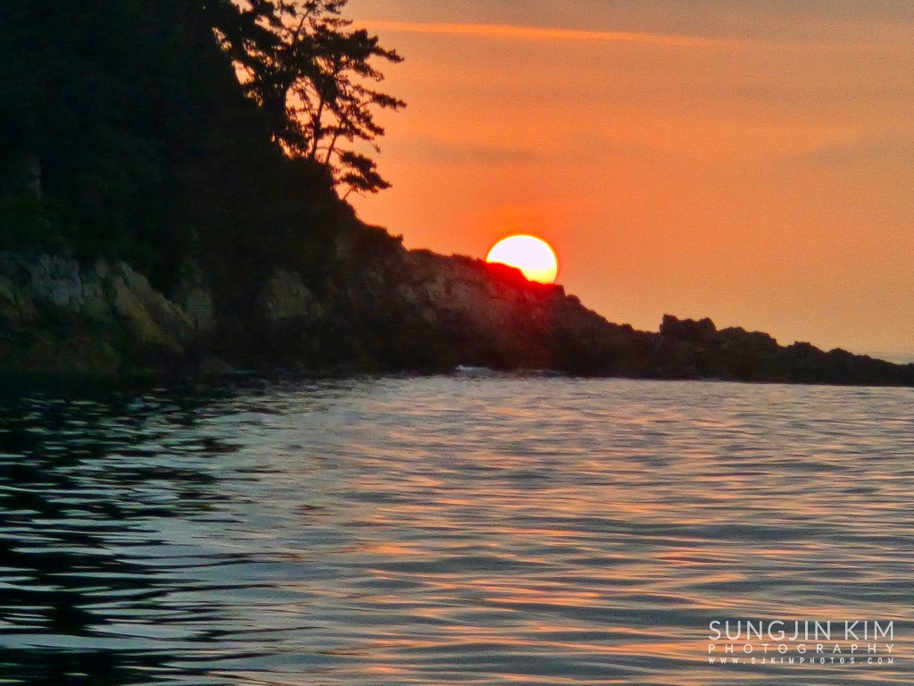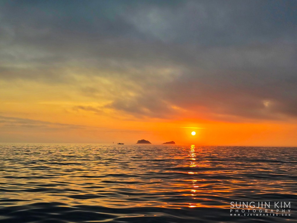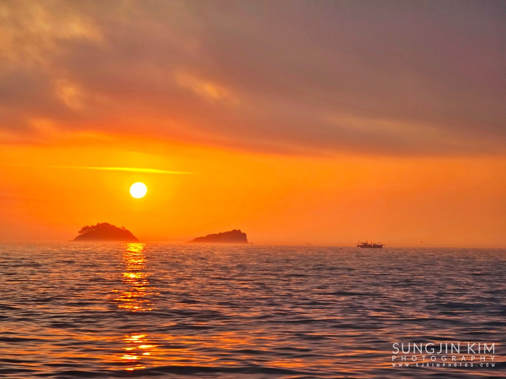 섬 뒤편으로 붉은 일출이 서서히 올라온다.