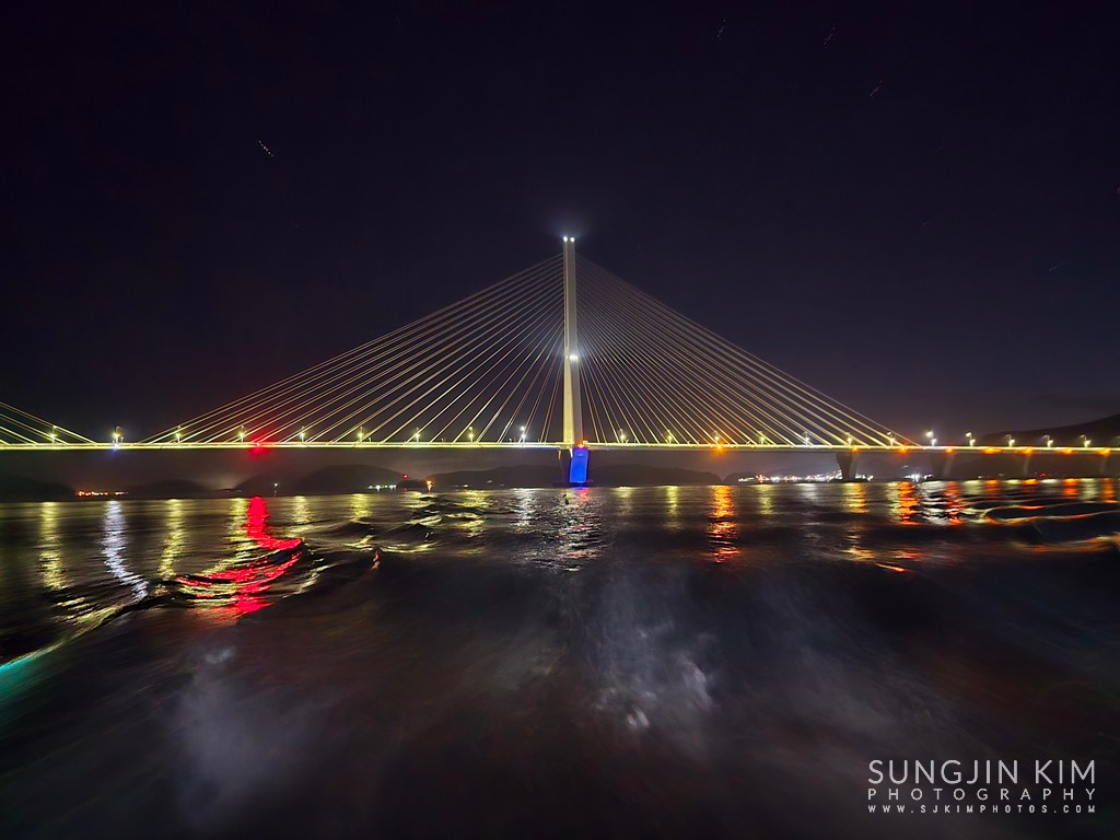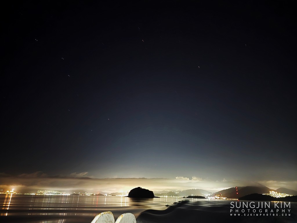 선미에서 보는 밤바다.. 저 멀리 하늘 위에 북극성과 북두칠성이 선명하게 보인다. 갤럭시 스마트폰으로 이렇게 별도 보이다니...