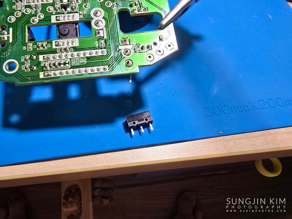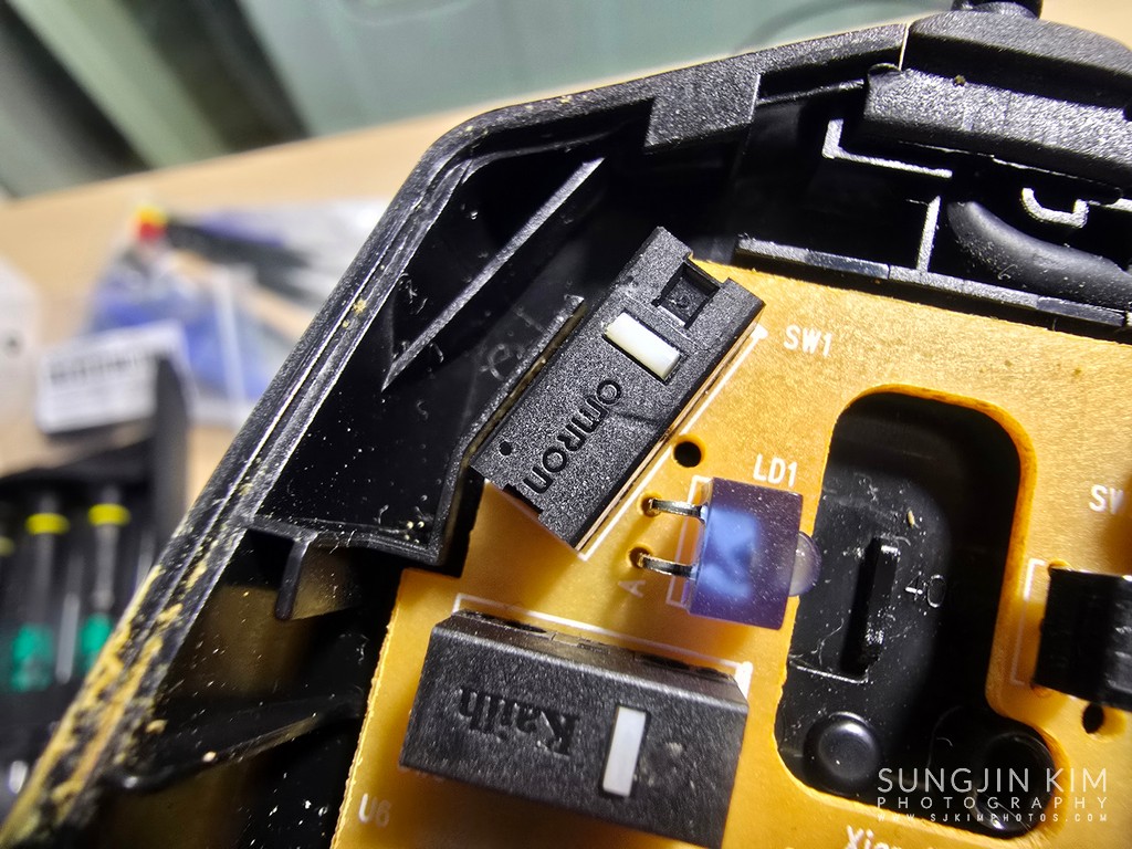 - 고장 스위치 확인: PCB를 분리하면 마우스 버튼에 연결된 마이크로 스위치들이 보입니다. (사진 5, 6, 7, 8 참고) 왼쪽과 오른쪽 클릭을 담당하는 스위치는 주로 Omron D2FC-F-7N(20M) 모델입니다. 다른 버튼들은 Kailh 스위치(사진 5, 6, 7의 'Kailh' 로고)가 사용되기도 합니다. 문제가 있는 왼쪽 버튼의 스위치를 교체할 것입니다.