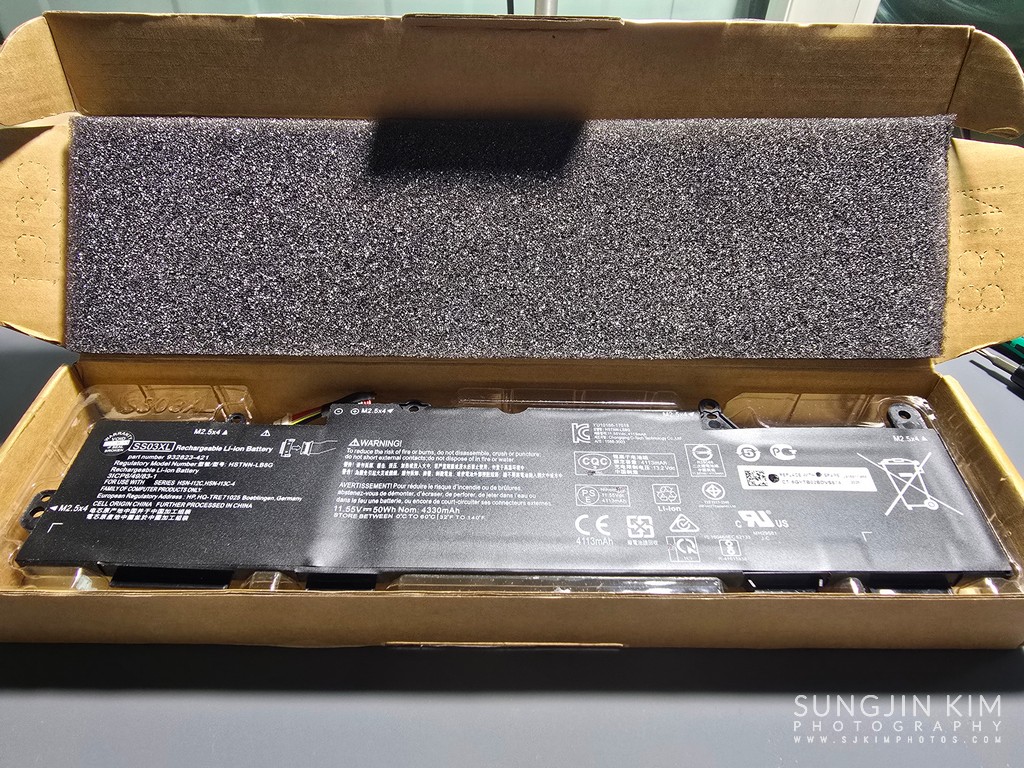 이제 본론인 배터리 교체 차례. 기존 배터리는 작업 전에 이미 인터넷을 통해 확인 후 동일한 모델의 배터리를 알리를 통해 주문해 두었다. (사진 3)을 보면 'SS03XL' 모델에 'HP part number 932823-2C1'이라고 쓰여있다. 배터리 교체 시에는 반드시 이 모델명을 확인하고 호환되는 제품을 구매해야 한다.