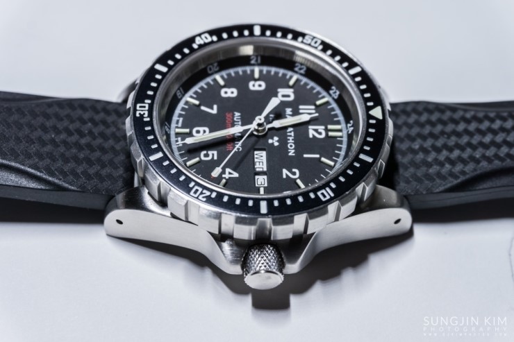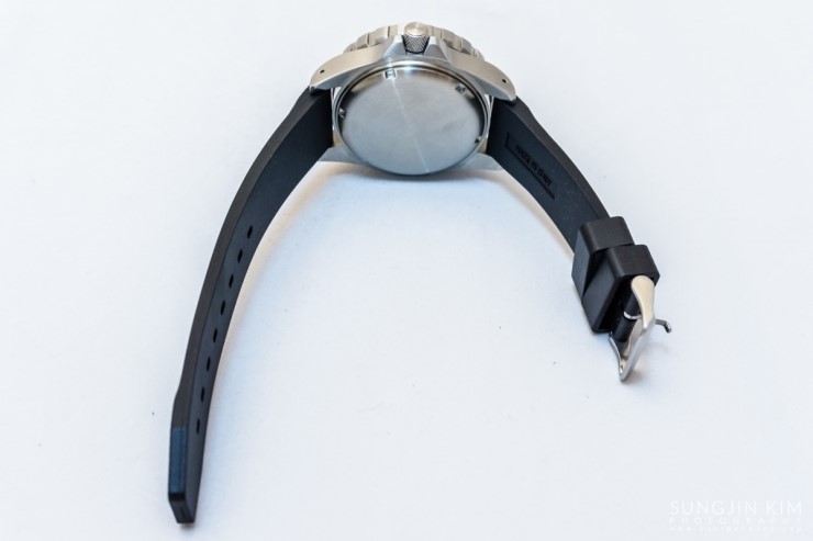 간과하기 쉽지만 케이스의 주요한 특징 중의 하나인 크라운가드는 5mm 길이의 크라운을 2.5mm 정도 견고하게 감싸고 있어서 크라운의 내구성을 보장해 줄 것 같다. 수중 또는 젖은 손이나 장갑을 낀 상태에서 접지력을 잃지 않게 하기 위해서 크라운에는 빗살무늬로 음각처리를 하여 오톨도톨한 느낌이 나게 만들어져 있다. 아울러 피부에 닿는 러그의 끝부분은 라운딩처리를 하는 세심함을 볼 수 있었다. 그리고 러그 양쪽에는 스프링바를 쉽게 탈착하여 스트랩의 교환을 용이하게 하기 위해 구멍이 뚫려있다.