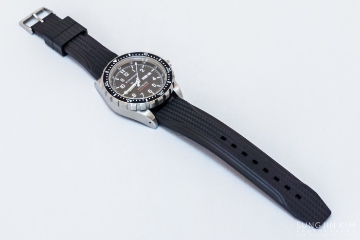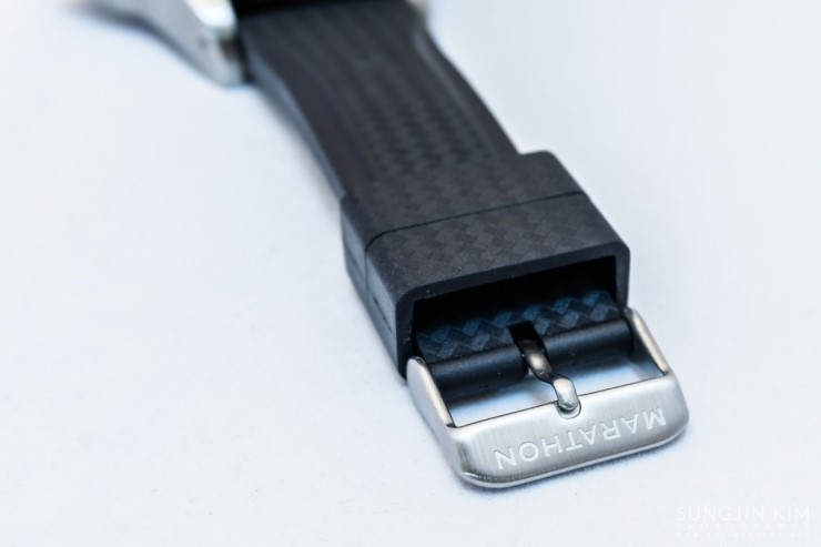 JDD의 기본 시계줄은 경화고무소재의 고무스트랩인데 바닐라향이 은은하게 나고 뒷면에 'Made in Italy'라고 쓰여진 것을 보면 이탈리아의 'Bonetto Cinturini' 제품인 것으로 보인다. 스트랩의 디자인은 카본 특유의 무늬에 버클은 스테인레스 스틸 소재이며 스트랩의 끝이 뜨는 것을 방지하기 위해 2개의 고무고리가 있다. 아울러 버클에는 'MARATHON' 이라는 브랜드명이 각인되어 있는데 왠지 모르게 믿음이 간다. 경화고무는 오존, 자외선 및 가혹한 수중환경 등의 외부환경에 대해서 탁월한 내성을 가진다.