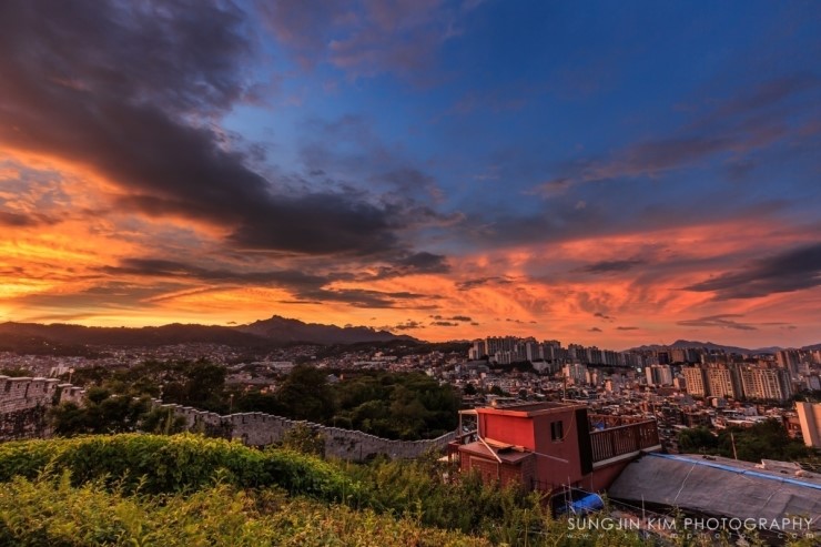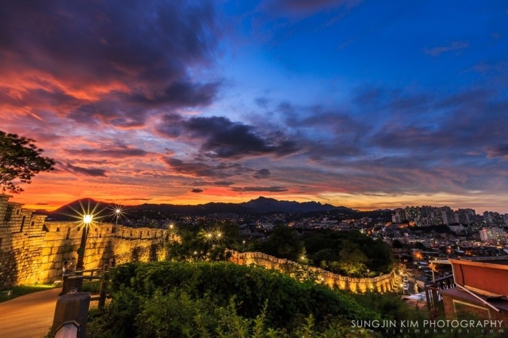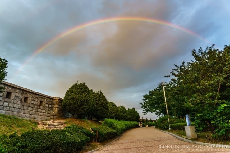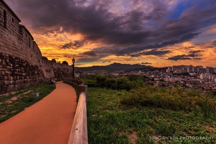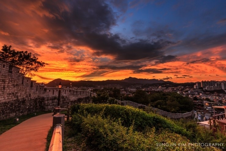이 곳에서 간단하게 서울성곽에 대해서 아이에게 설명해주고 숙제를 위한 인증샷 몇장을 찍었다. 그러는 와중에 비가 아주 살짝 내렸는데 덕분에 평소에 아주 보기 힘든 무지개까지 볼 수 있었다. 그렇게 아이와 함께 무지개를 보고 기분 좋게 성곽길을 따라 내려가는데 해가 지는 하늘이 심상치 않았다. 산책로에서 잠시 기다려보니 지난 번 남산에서 봤던 하늘보다는 못하지만 그래도 오렌지빛으로 물들어 타들어 가고 있었다. 삼각대가 없는 관계로 카메라를 얼른 산책로 옆의 난간 위에 아슬아슬하게 올려놓고 간신히 담을 수 있었다.