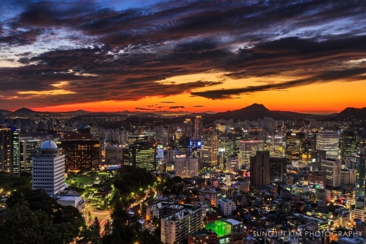 일몰시간이 가까워진 시간에 한참을 기다려 탄 남산을 오르는 순환버스가 이날 따라 더욱더 거북이 느림보처럼 느껴졌다. 버스에서 내리자마자 발걸음이 느린 와이프와는 나중에 만나기로 하고 촬영포인트로 미친 듯이 땀을 흘리며 달렸다. 이미 해는 지평선 너머로 내려가고 있었고 하늘은 119라도 불러야될 만큼 불타고 있었다. 급한 와중에 남산도서관쪽으로 내려가는 계단 방향에 있는 잠두봉 포토아일랜드의 위치가 이날 따라 제대로 생각이 나지 않아 케이블카 타는 곳 부근에서 헤매고 있었다. 그렇게 시간을 허비했지만 다행히 평소에는 담을 생각도 못했던 구도의 사진도 담게 되어서 다행이었다.
