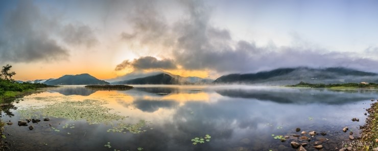 춘천에서 화천으로 넘어가는 국도를 달리면서 그 아름다운 풍경에 늘 감탄만 하다가 드디어 마음먹고 지도를 보고 나름대로 포인트를 잡았다. 양구의 국토정중앙천문대에서 서울로 돌아오는 새벽길에 미리 찾아두었던 강변의 포인트에 들려 자리를 잡고 해가 나오기만을 기다렸다. 늦은 여름임에도 산이 많은 강원도라 꽤 쌀쌀한 새벽이었다. 능선 너머로 여명이 밝아 오면서 강위는 마치 목욕탕을 연상케 할 정도의 물안개가 피어나고 하늘의 구름은 강을 따라 역동적으로 움직이고 있었다. 자리잡고 기다린 보람이 있는 순간이었다.