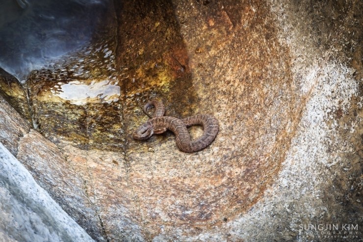 촬영도중 만난 불청객.. 삼각대 바로 옆에 또아리를 틀고 있었는데 하마터면 보지 못하고 옆으로 갈 뻔했다. 나중에 생김새를 보고 찾아보니 살모사였는데 아마도 잘못됐으면 계곡에 혼자 누워서 신음하고 있지 않았을까 싶다..