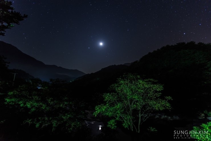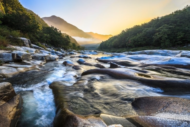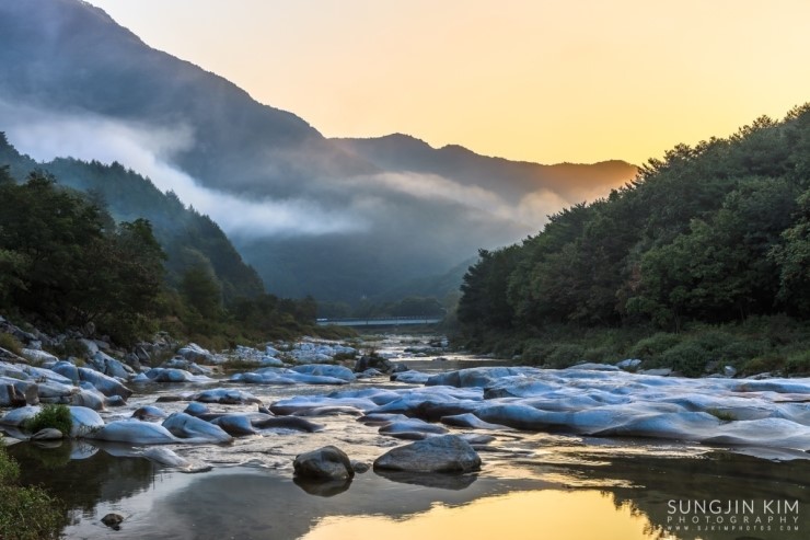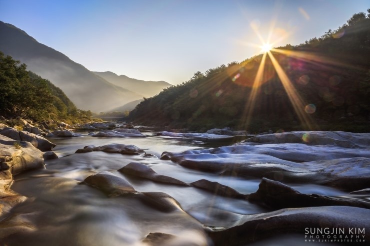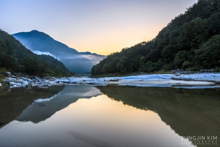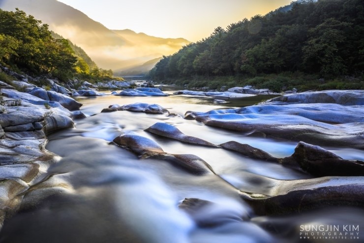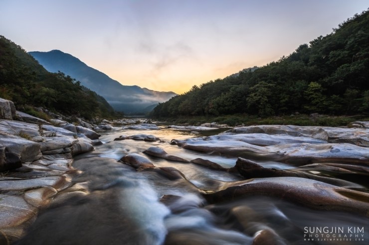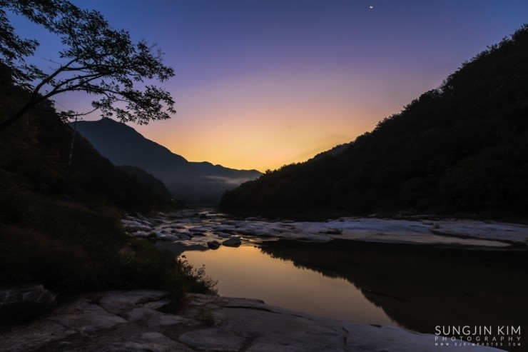 철원에서 은하수 촬영을 마치고 그냥 서울로 돌아오긴 왠지 아쉬워서 가까운 화천의 곡운구곡에서 아침 풍경을 담기 위해 새벽3시에 이동했다. 곡운구곡이 워낙 길어서 몇 군데 들려서 촬영할 만한 위치를 찾다가 제3곡 신녀협에서 좋은 위치를 찾아 아침이 밝기를 기다리며 차에서 1시간 정도 쪽잠을 자며 기다렸다. 피곤했었는지 금방 곯아떨어져서 알람이 울리는 소리에 놀라 깨어났는데 저 멀리 계곡 끝에서 아름다운 오렌지빛의 여명이 밝아오고 있었다.