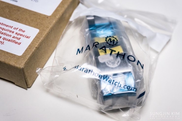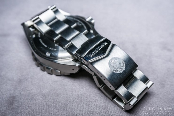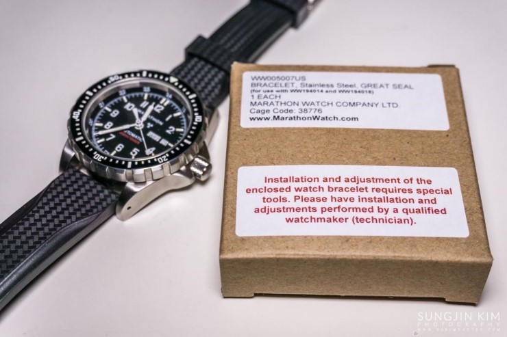 를 잘 차고 다니던 중 Marathon 홈페이지를 방문해 보니 연말을 맞아 이것저것 세일을 하고 있었다. 원래 금속밴드를 선호하였기에 가격을 확인해 보니 다소 비싸긴 했지만 평소가격에 비해서는 큰 폭으로 할인을 하고 있었다. 큰 맘 먹고 배송대행업체를 이용하여 US Great Seal 22mm 금속밴드(https://www.marathonwatch.com/product/stainless-steel-bracelet-usgreatseal-22mm)를 주문하여 기본장착 되어 있는 고무밴드 대신 금속밴드로 교체 하였는데 가격이 다소 비싼게 흠이긴 하지만 고무밴드에 비해서는 확실히 만족도가 높다.