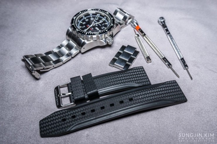 를 잘 차고 다니던 중 Marathon 홈페이지를 방문해 보니 연말을 맞아 이것저것 세일을 하고 있었다. 원래 금속밴드를 선호하였기에 가격을 확인해 보니 다소 비싸긴 했지만 평소가격에 비해서는 큰 폭으로 할인을 하고 있었다. 큰 맘 먹고 배송대행업체를 이용하여 US Great Seal 22mm 금속밴드(https://www.marathonwatch.com/product/stainless-steel-bracelet-usgreatseal-22mm)를 주문하여 기본장착 되어 있는 고무밴드 대신 금속밴드로 교체 하였는데 가격이 다소 비싼게 흠이긴 하지만 고무밴드에 비해서는 확실히 만족도가 높다.