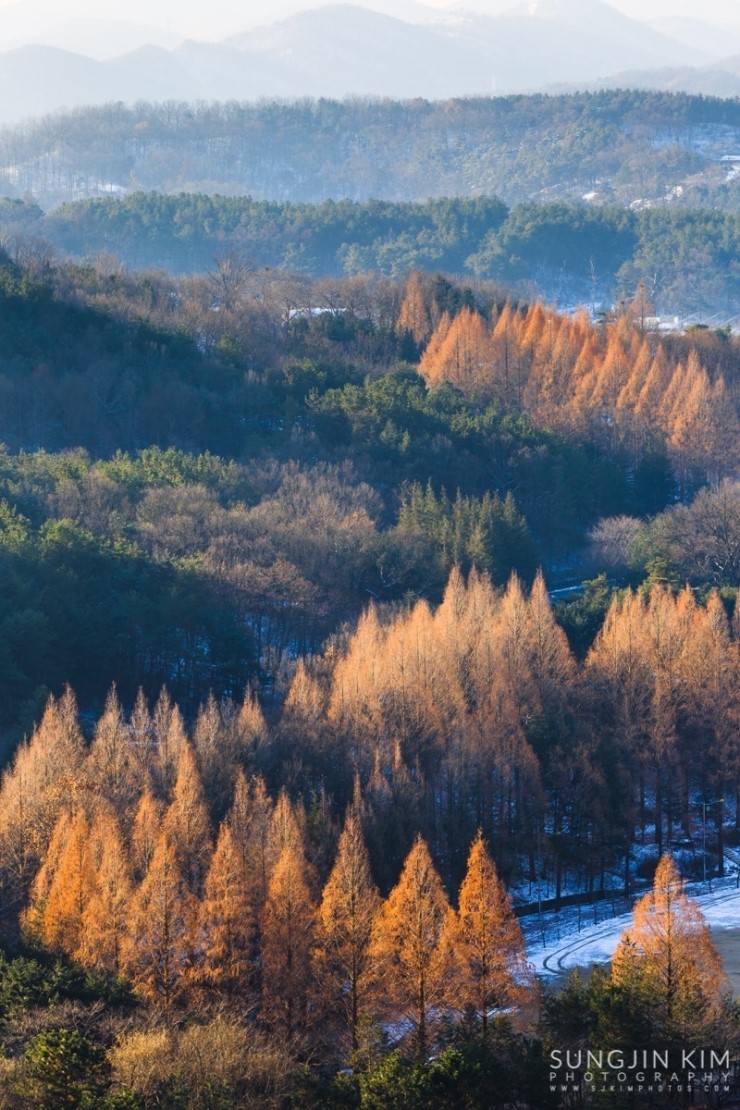 금강로하스의 풍경을 담고 서울로 올라가던 중 대청댐을 조망할 수 있는 전망대에 잠시 들려 내려다보니 눈에 띄는 풍경이 있었다. 나무 종류는 모르지만 줄지어 서 있는 모습이 마치 S라인을 연상시켰다.
