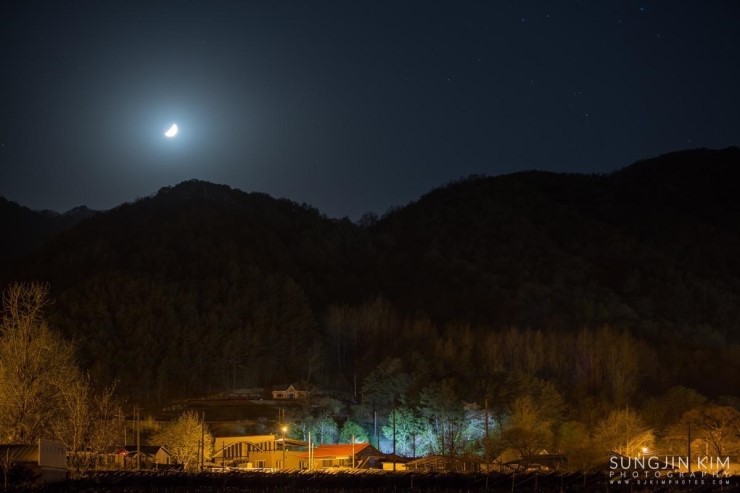 사진 찍은 장소에서 가까운 마을의 풍경. 산 능선 위로 반달이 떠 있는 모습이 예뻤는데 눈으로 보는 만큼 담기가 쉽지 않다.