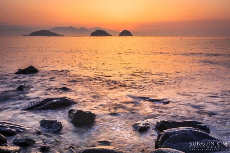 어두컴컴한 하늘도 잠시, 금방 수평선 너머로 먼동이 트기 시작했는데 하늘도 무심하지 하늘색도 원하던 빛깔이 아니었다. 자리를 잘못 잡았는지 한참을 찍다보니 해가 섬 뒤편에 약간 가려서 나타나기 시작했다. 얼른 삼각대 들고 일출 방향에 맞춰 해변을 뛰기 시작했는데 역시 정확하게 형제섬이라 불리는 두 개의 섬 사이에 해를 넣기에는 무리였다.