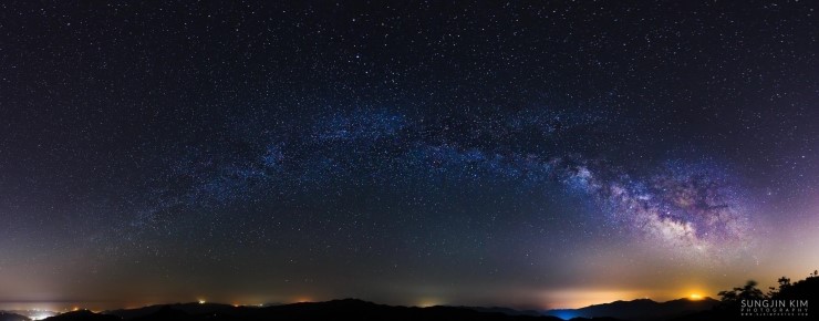 아무리 광각렌즈를 사용하더라도 은하수를 한장의 사진에 온전하게 전부 담기에는 힘들어서 여러 장의 사진을 이어붙여 만든 파노라마 사진이다.