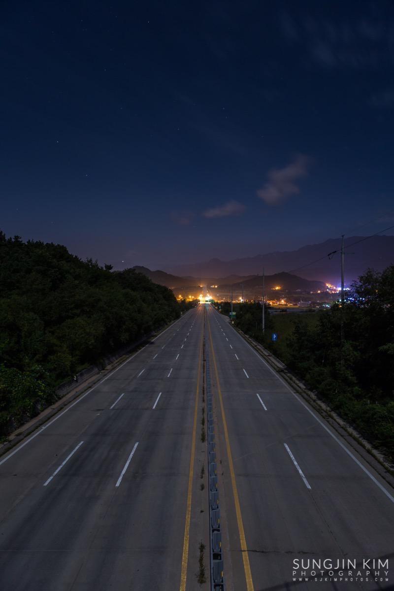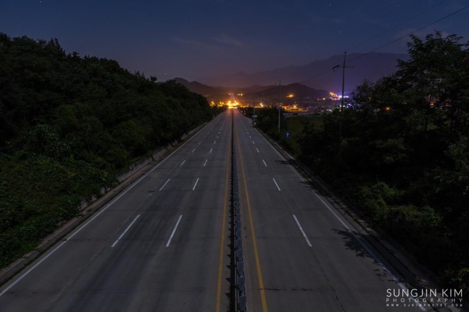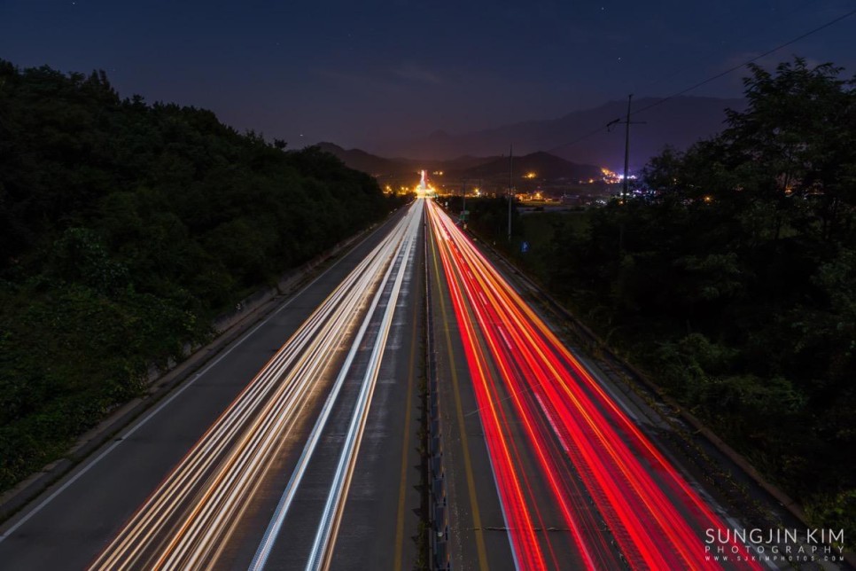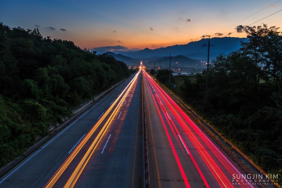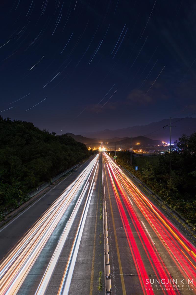 평소 다니면서 눈여겨 봐 뒀던 장소의 위치를 지도앱에 저장해 두었다가 결국 몇 년이 지나서야 들려서 사진으로 담아왔다. 그 동안 바빠서 못 만나던 지인분과 담소도 나누고 라면도 먹고 보름달 휘영청 밝은 밤에 지나가는 자동차 궤적 그리고 선명하진 않지만 별궤적도 담고 아침 해 뜰 때까지 기다리다가 따스한 아침 햇살에 물든 오렌지 빛 도로까지 담고 돌아왔다.