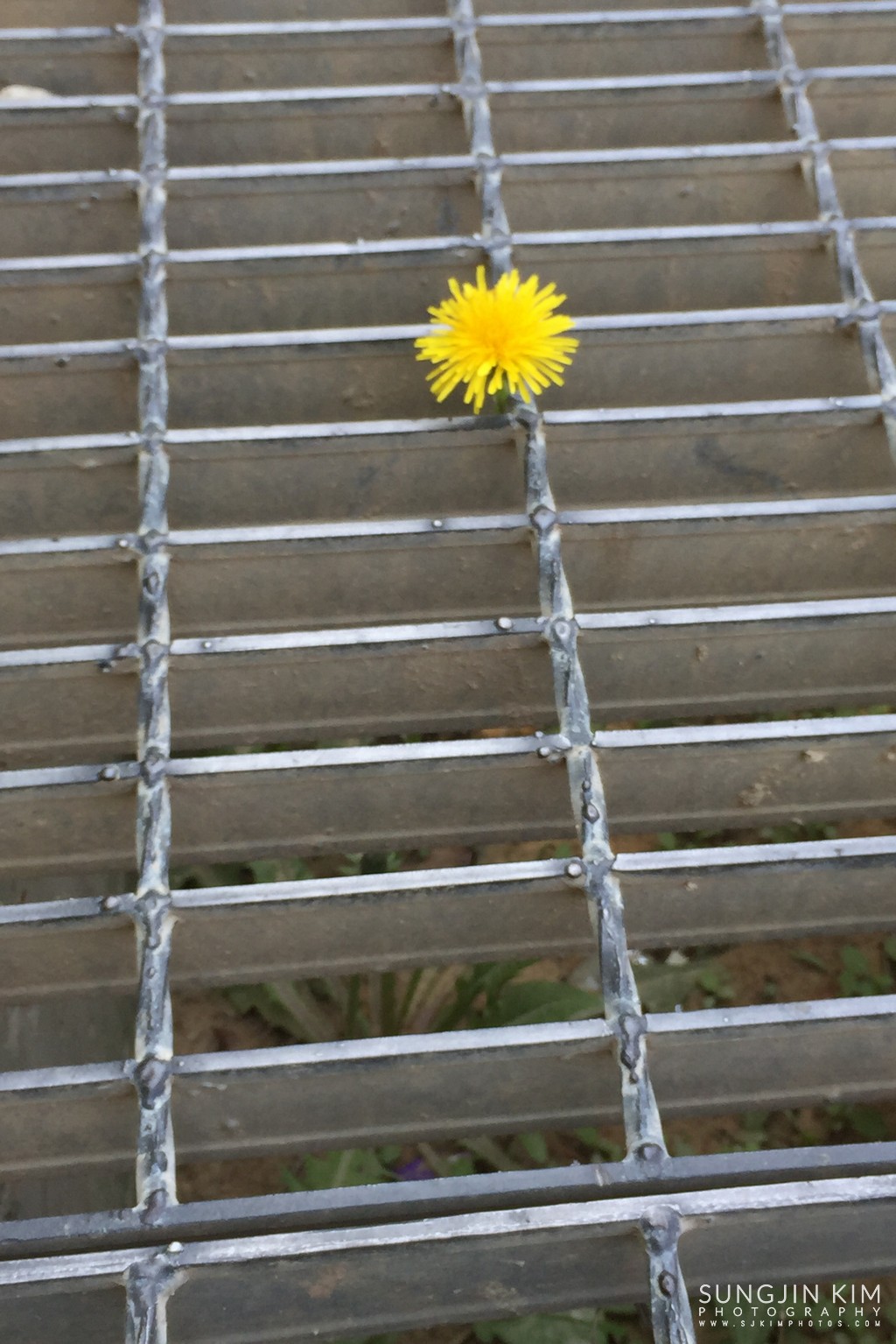 공원 배수구 안에 피어 있는 한 포기 민들레가 힘겹게 탈옥을 시도하고 있다...