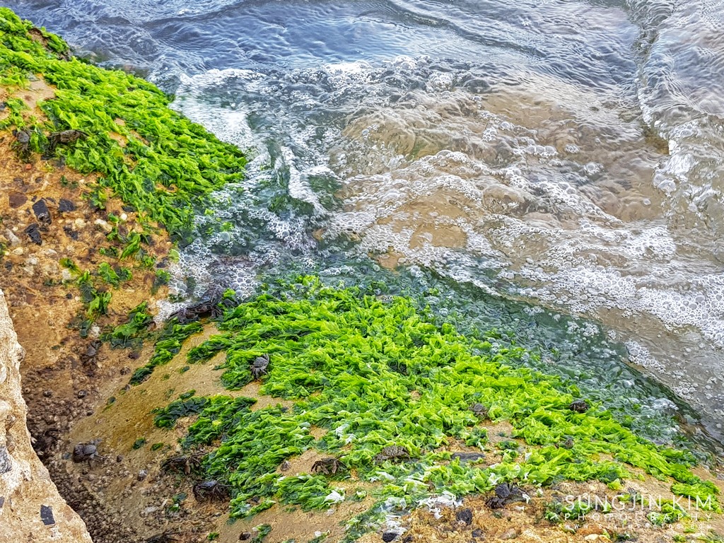 해변에 있는 테트라포드에 붙어있는 색깔이 아름다운 이끼
