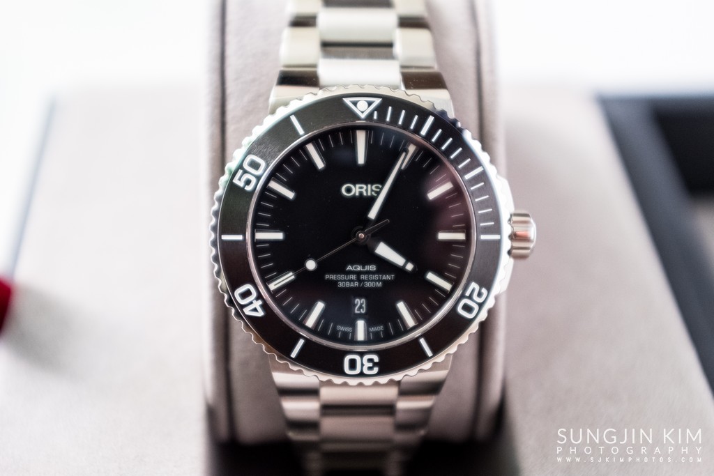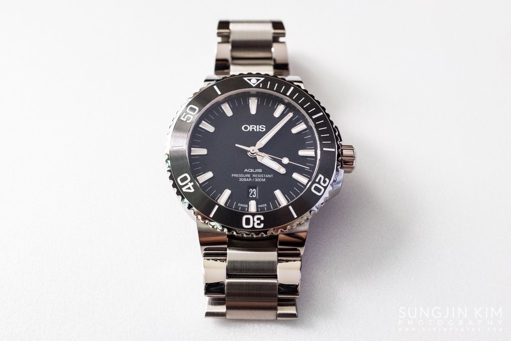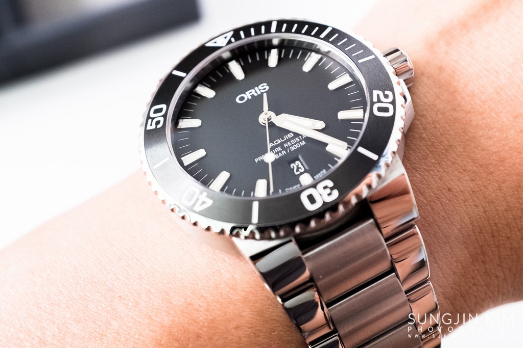 항상 이제 더 이상 시계를 사지 않고 다짐을 하지만 어느 순간 나도 모르게 홀린 듯 쇼핑몰에서 주문을 하게 된다. 그렇게 구매하게 된 시계는 중저가 다이버 시계 중에서 많은 인기 얻고 있는 레퍼런스 번호 01 733 7730 4154-07 8 24 05PEB의 Oris Aquis Date 43.5mm 크기에 블랙 다이얼과 블랙 세라믹 베젤이 적용된 모델이다.