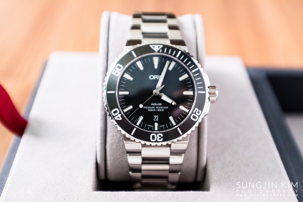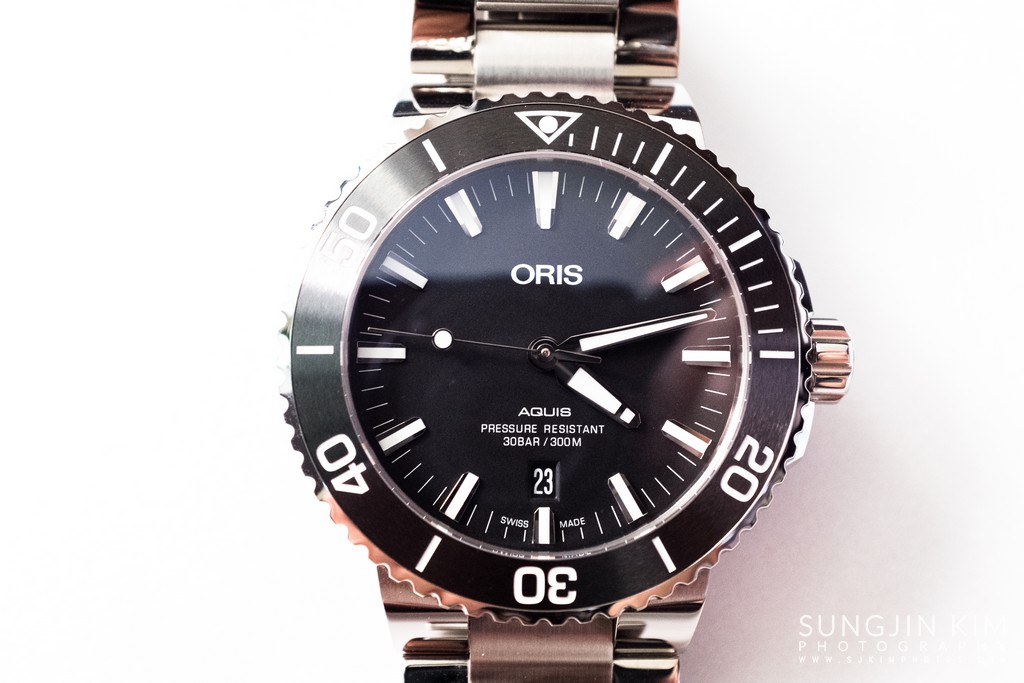 항상 이제 더 이상 시계를 사지 않고 다짐을 하지만 어느 순간 나도 모르게 홀린 듯 쇼핑몰에서 주문을 하게 된다. 그렇게 구매하게 된 시계는 중저가 다이버 시계 중에서 많은 인기 얻고 있는 레퍼런스 번호 01 733 7730 4154-07 8 24 05PEB의 Oris Aquis Date 43.5mm 크기에 블랙 다이얼과 블랙 세라믹 베젤이 적용된 모델이다.