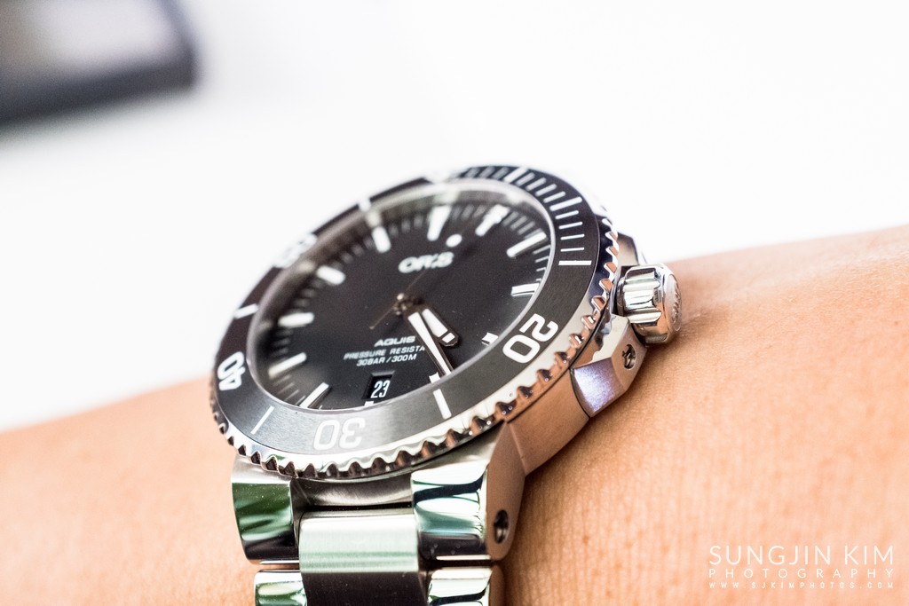 Oris는 다른 버전의 Aquis를 대형과 소형 케이스 모두 생산한다. 리뷰하는 이 43.5mm 폭의 모델은 나의 손목에 아주 이상적이다. 오리스는 폭 40mm 이하에서 45mm 이상에 이르는 다양한 스타일과 크기로 다른 다이브 워치를 만들고 있다.