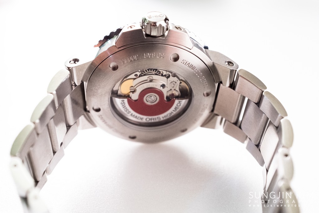 케이스 뒷면에는 시계 전면에 사용된 것과 동일한 사파이어 유리창을 통해 무브먼트의 작동 모습을 볼 수 있다. 다이버 시계에서는 무브먼트를 볼 수 있는 것이 흔하지 않기 때문에 이것은 좋은 기능이라고 볼 수 있다. 오리스는 그 무브먼트를 오리스 733이라고 부른다. 이 무브먼트는 스위스산 Sellita SW200-1이 기본 모델이다(ETA 2824-2의 복제 모델임). 무브먼트는 사실 장식이 화려하지는 않지만 상징적인 빨간색 오리스 자동 회전자를 가지고 있다. 이 무브먼트는 4Hz에서 작동하며 38시간의 파워 리저브를 제공한다. 한 가지 아쉬운 점은 오리스가 약간 더 성능이 우수한 SW300을 사용 했으면 하는 생각을 한다.