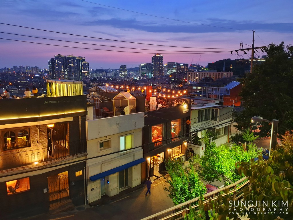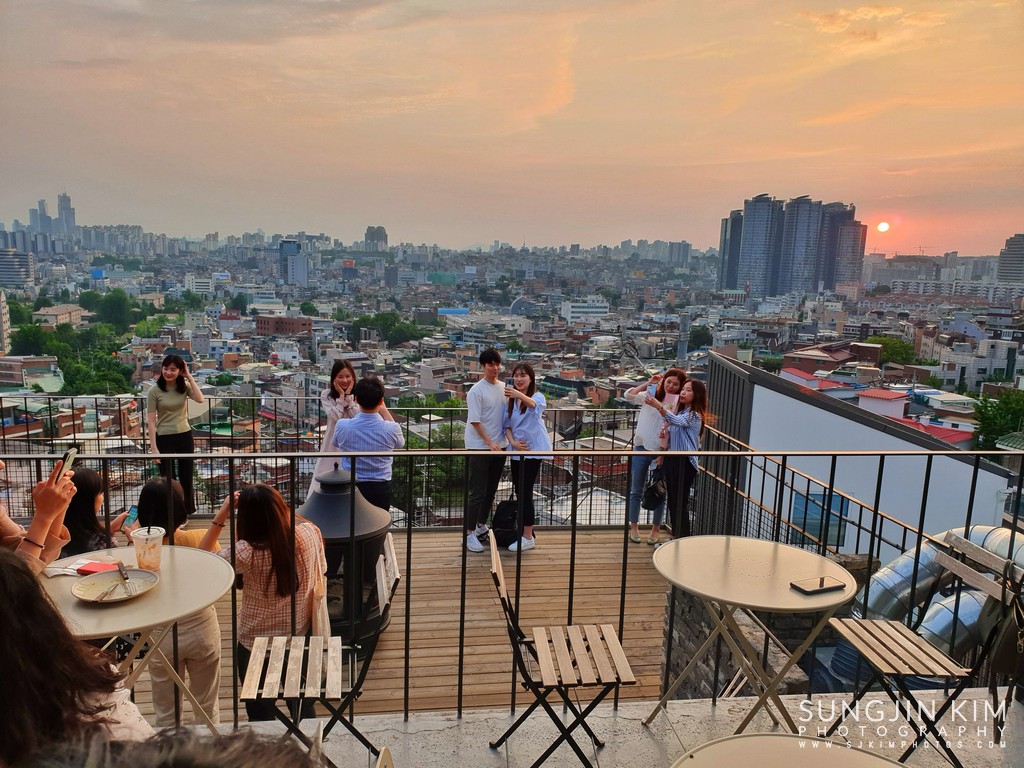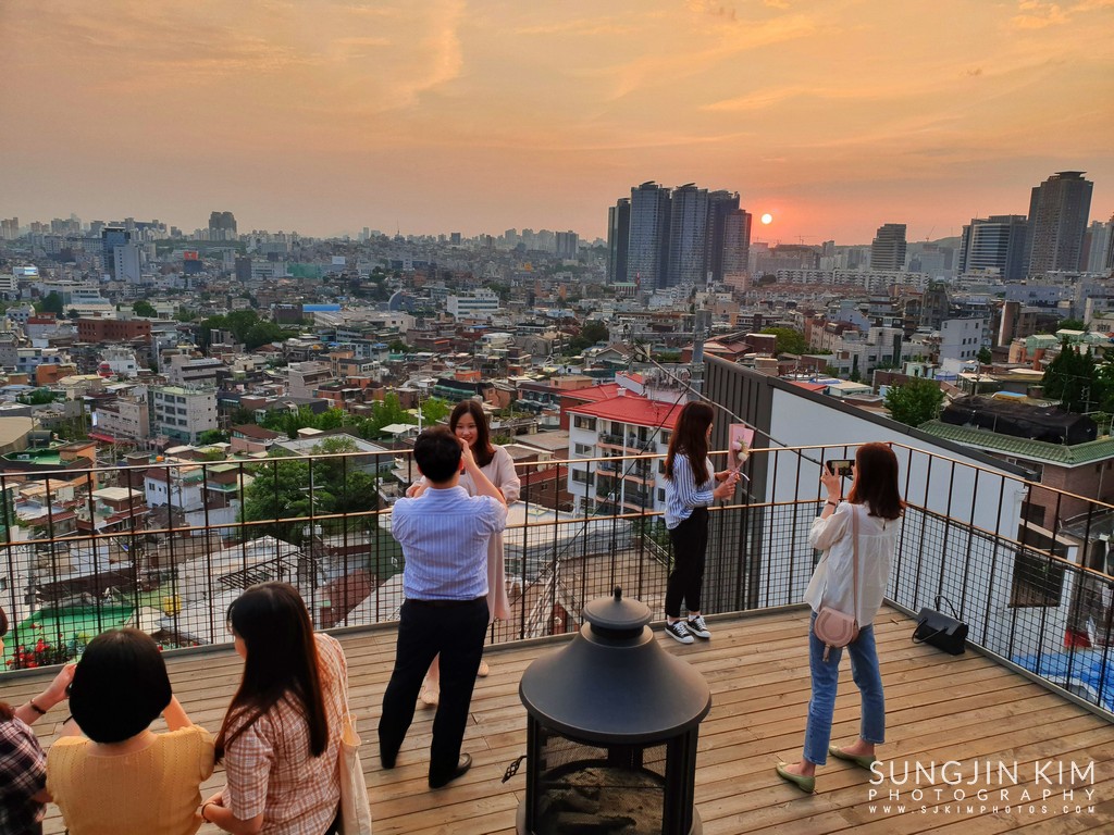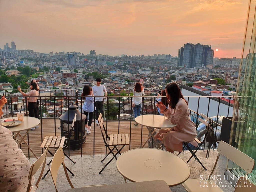 루프탑에서 사진찍기에 열심인 사람들. 저 멀리 용산 방향으로 일몰이 예쁘다.