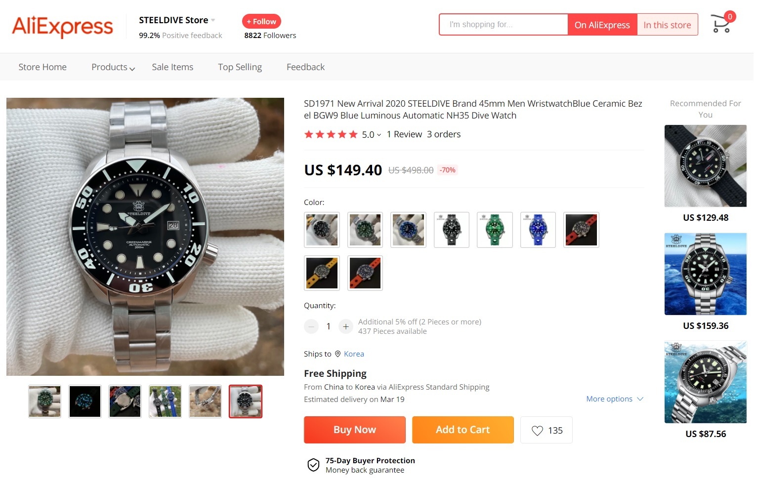작년 여름 알리익스프레스에서 한창 할인행사할 때 최종 구매 금액 $104 정도를 주고 STEELDIVE의 SD1971 다이빙 시계를 구매했다. 디자인은 세이코의 SBDC001과 많은 부분이 유사해서 나중에 다이얼만 교체해서 착용할 생각이었다.