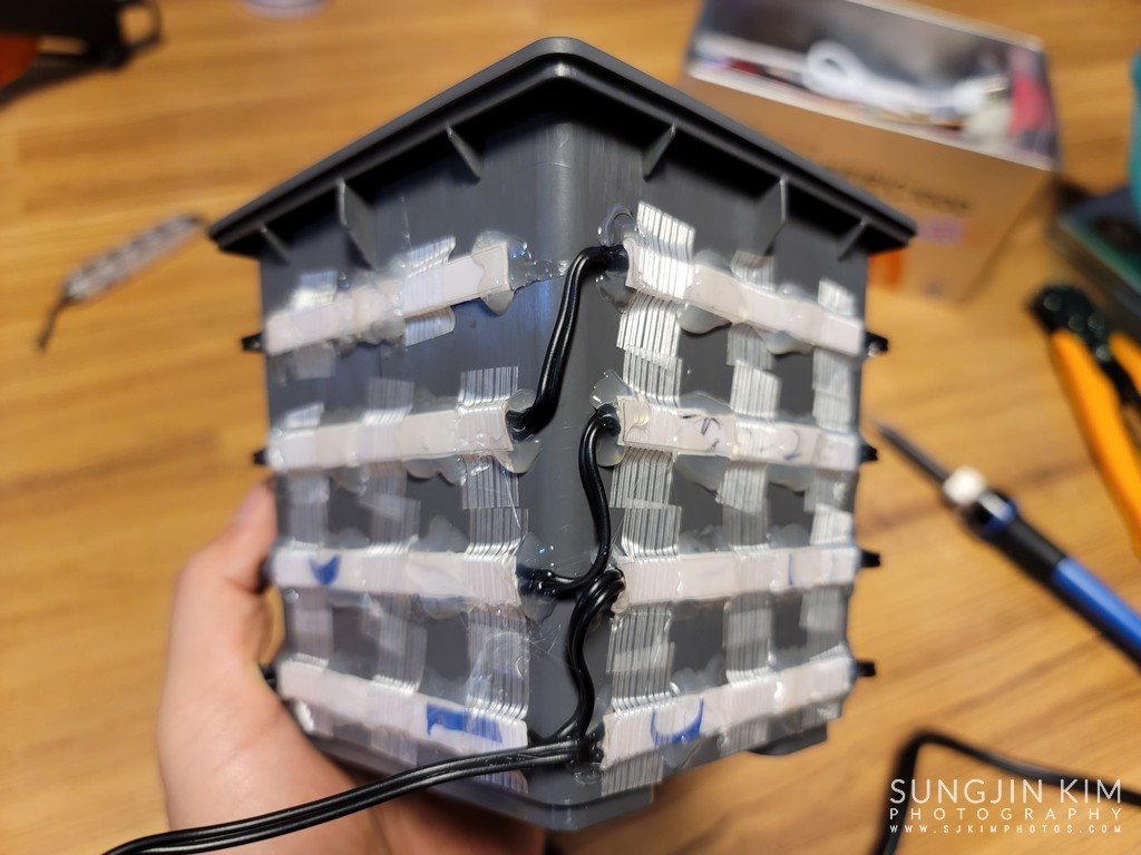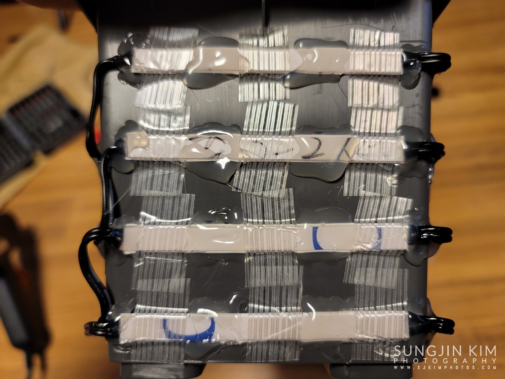 드디어 LED 스트립을 미리 뚫어놓은 구멍에 맞추어 필라멘트 테이프로 고정한 후에 글루건을 이용하여 움직이지 않도록 마무리한다.