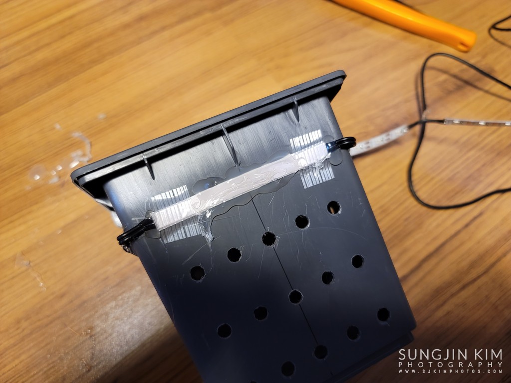 드디어 LED 스트립을 미리 뚫어놓은 구멍에 맞추어 필라멘트 테이프로 고정한 후에 글루건을 이용하여 움직이지 않도록 마무리한다.