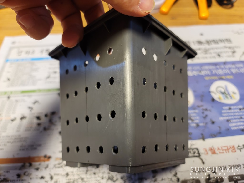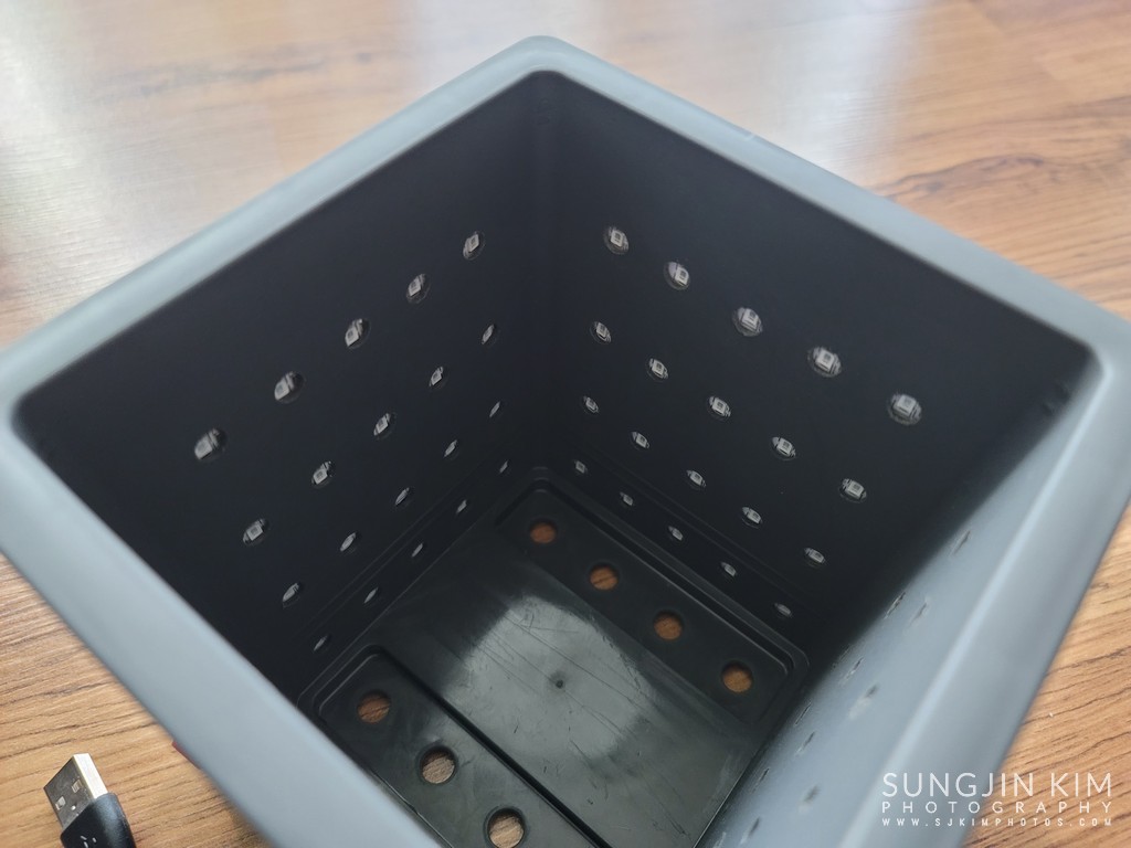 다이소에서 구매한 플라스틱 미니 화분. 내측 및 외측 케이스로 이루어져 있어서 두 개를 분리하면 내부 비어있는 공간이 나온다. 이 비어있는 공간에 미리 제작해 둔 자외선 LED 스트립을 장착해 주면 된다.