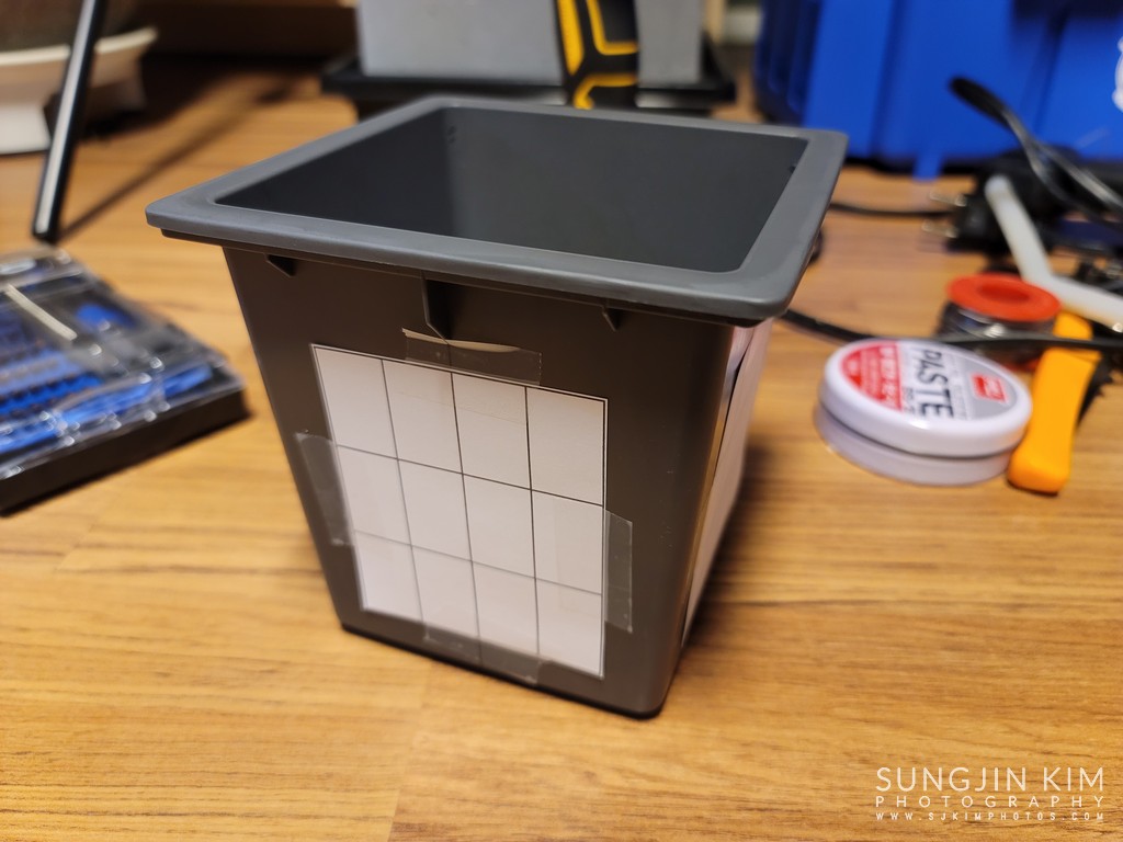 LED가 장착될 자리를 사전에 밑그림을 작성하여 4면에 모두 붙여 두었다. LED가 노출될 자리는 밑그림에 맞추어 송곳으로 표시를 해둔다.